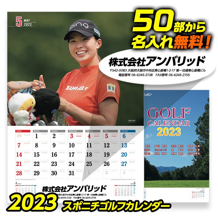 人気の女子プロゴルファー12名が登場、2023スポニチゴルフカレンダーを販売開始。ゴルフコンペ景品通販の「エンタメゴルフ」では、50部から無料で名入れサービスも。