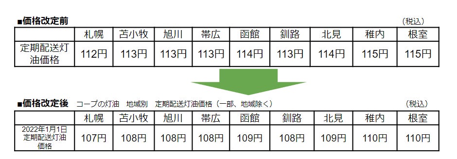 コープさっぽろの関連会社である株式会社エネコープ(以下エネコープ)は、生活に関わる物価高騰や年末年始の気温低下による暖房費増に対して少しでもお役に立てるよう、「コープの灯油」を利用されている組合員の皆さんの為に、2022年1月1日(土)より「コープの灯油」を現行価格より5円/ℓ値下げすることにいたしました。