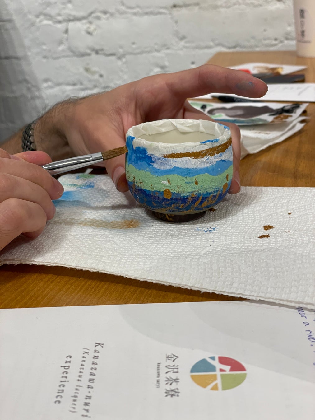 当日はあっという間のお時間でしたが、吉岡氏の指導のもと、参加者は白磁の九谷焼の器に、漆塗りの技法で現代風に彩色する「金沢塗」を体感。完成した作品で、「雪月華」のシグネチャーメニューである抹茶を味わうワークショップとなりました。