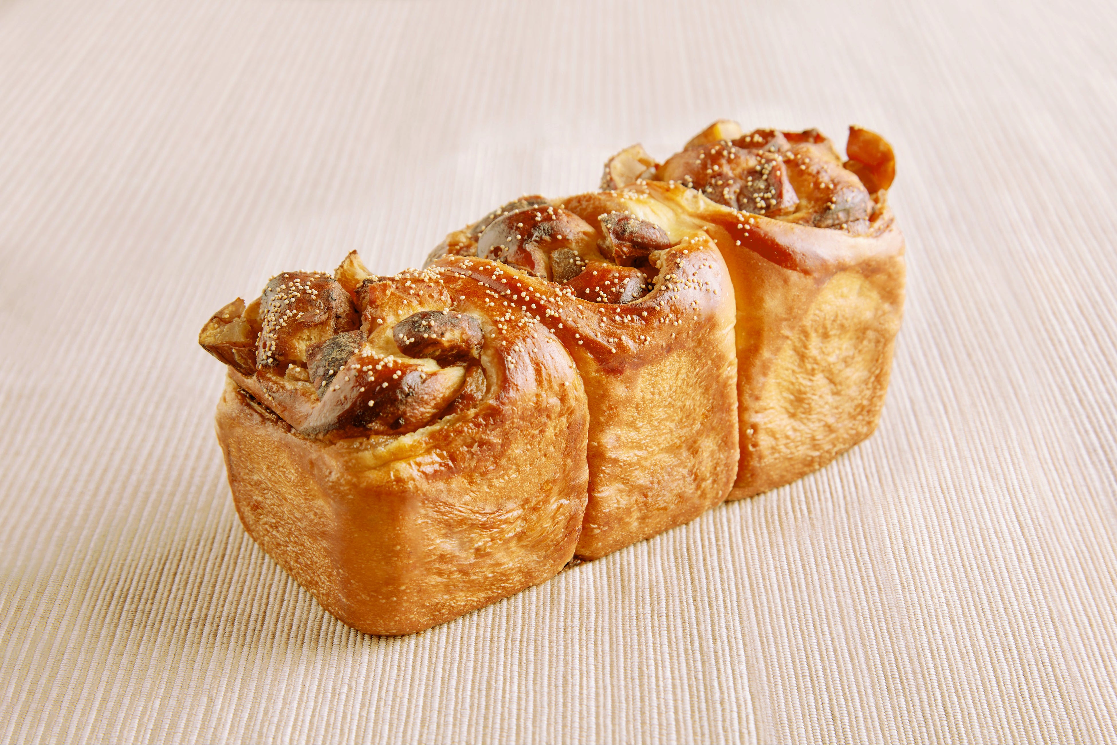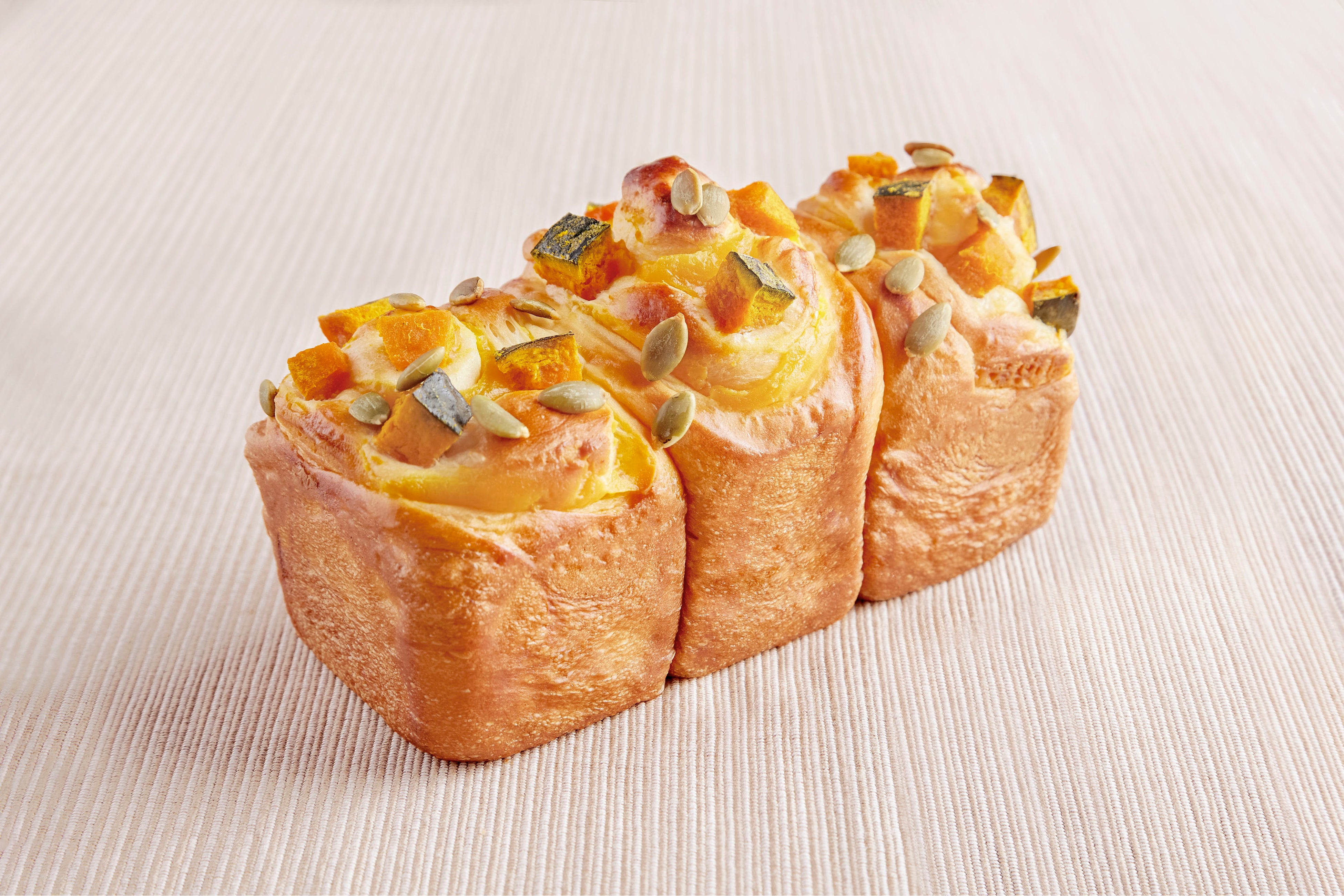 かぼちゃクリームを練り込み、角切りかぼちゃとパンプキンシードをトッピングしてふっくら焼き上げました。ふわふわのパンにたっぷりのかぼちゃとパンプキンシードの食感がアクセント。