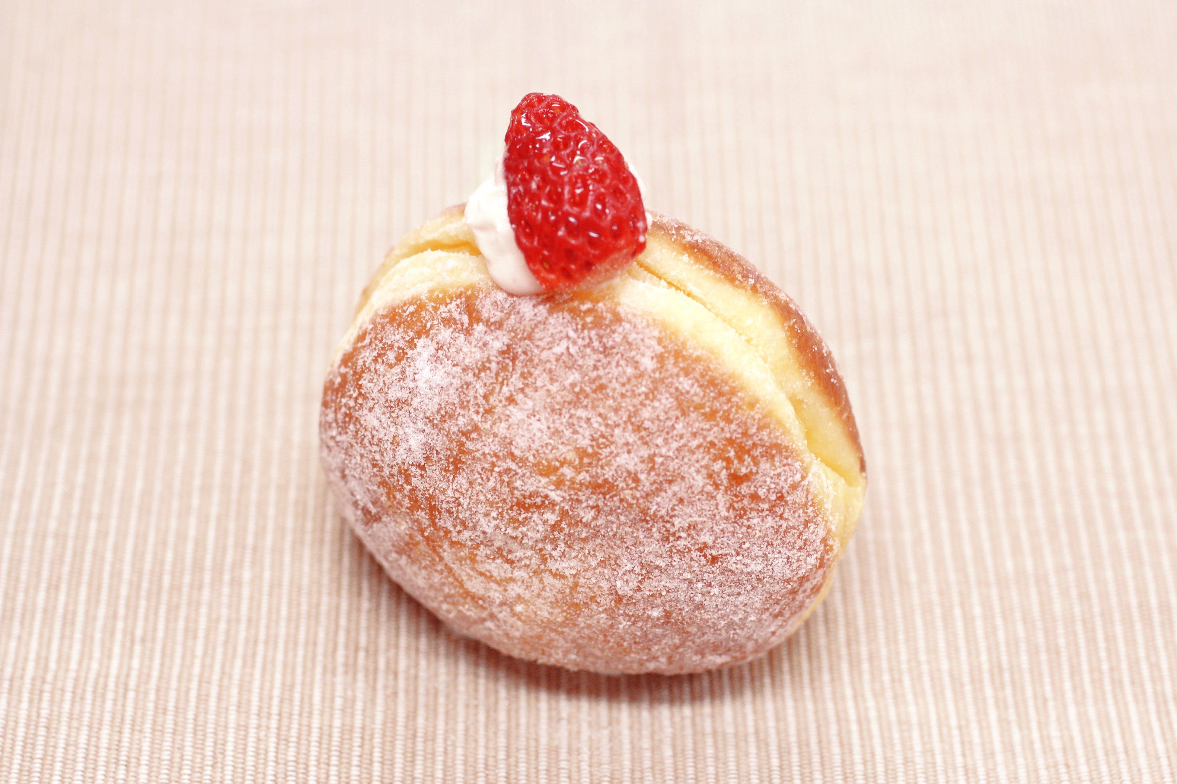 ふわふわのブリオッシュ生地にストロベリークリームを混ぜた自家製生クリームを溢れんばかりに詰め込み、ストロベリーをトッピングした見た目も可愛いドーナツ。