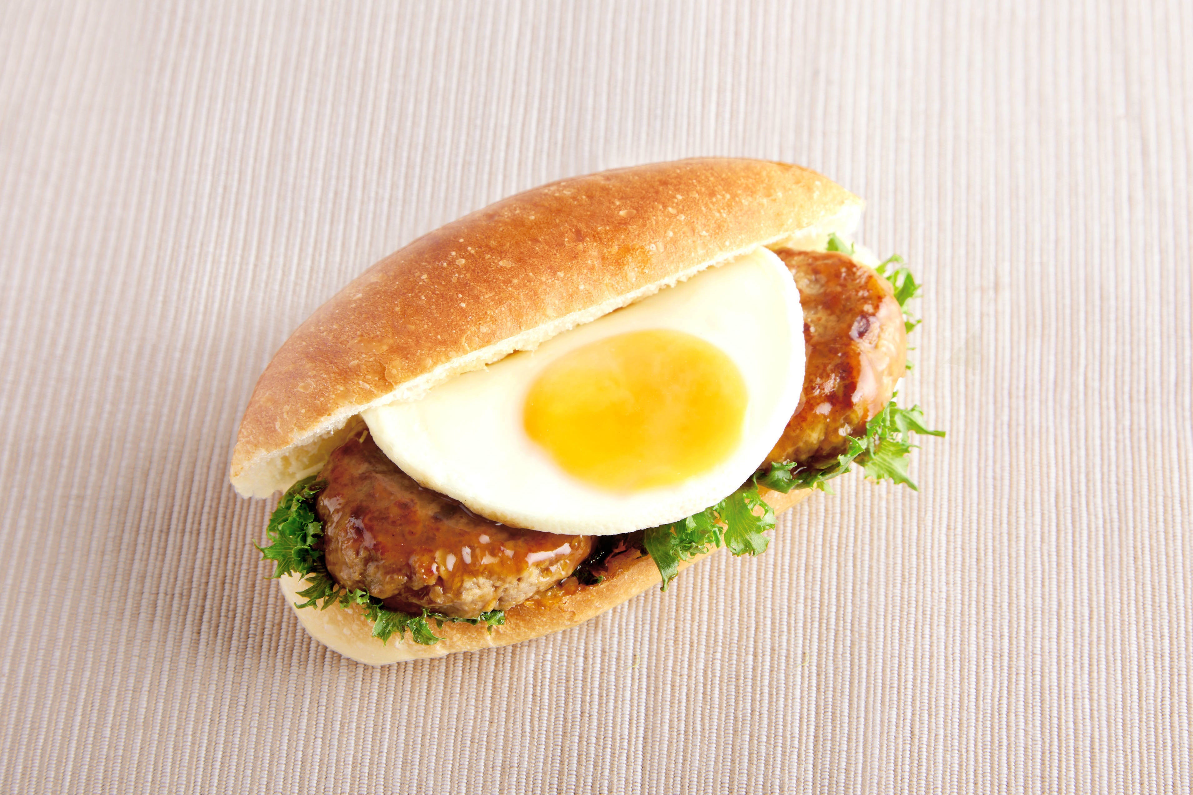 ジューシーなテリヤキハンバーグの上に月に見立てた目玉焼きをトッピング。ハンバーグと大きな目玉焼きが相性抜群のボリューム満点のコッペパン。