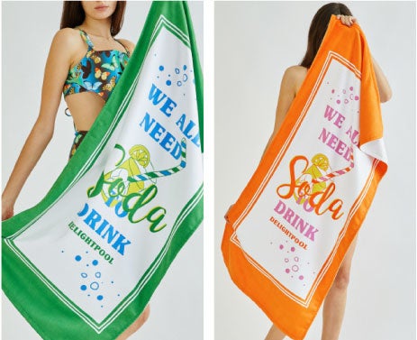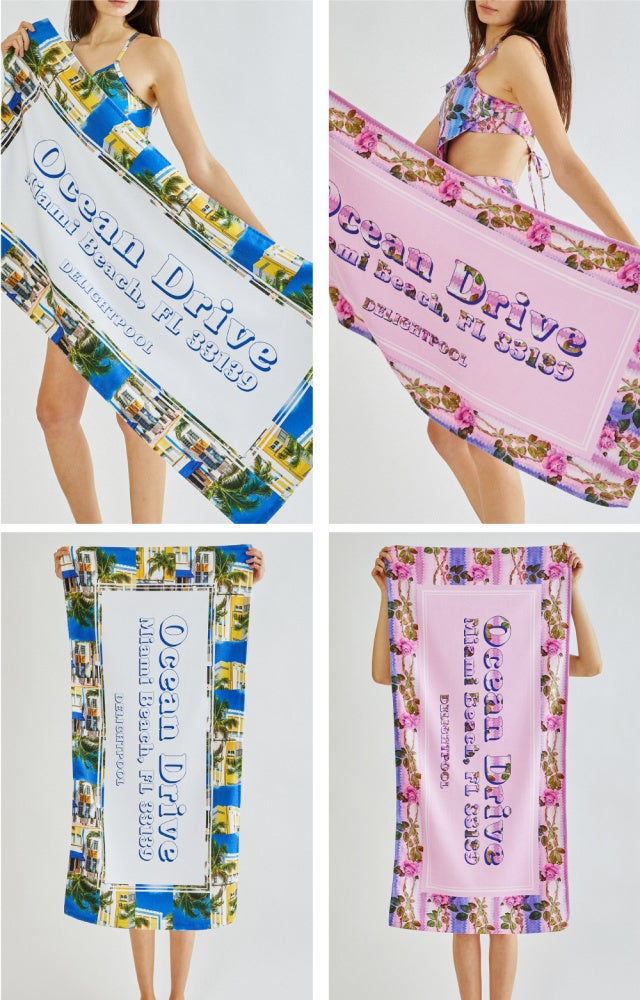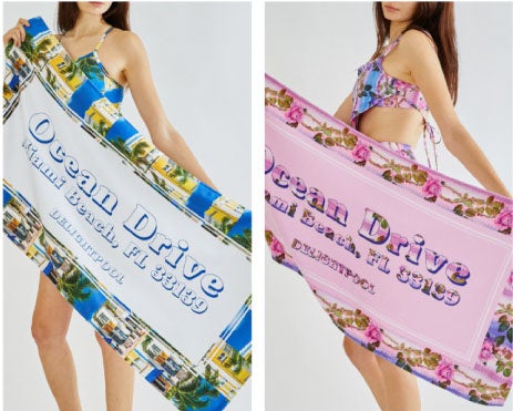 水着の柄がそのまま印刷されたマイクロファイバー素材のビーチタオルと一緒にバカンスルックを演出してみてください。