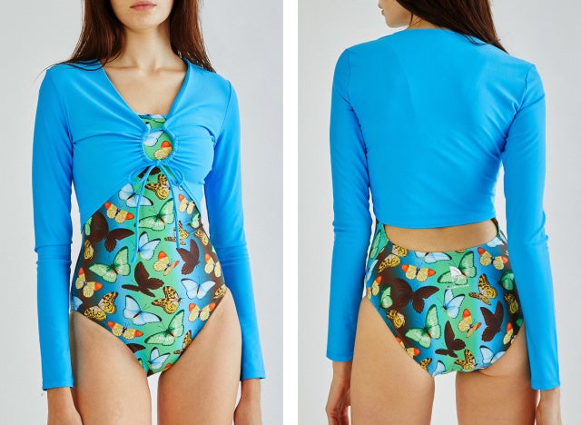 流行を意識したロマンチックムードのローズとバタフライをモチーフに、水中でより美しく映えるカラーで水着を製作しました!