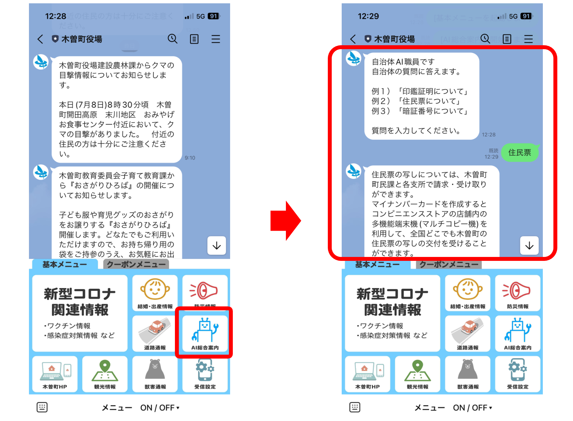 自治体の通常業務において問い合わせの多い内容をLINEなどで受付し、AIチャットボットで問い合わせの返信を代行することでサポート業務の効率化が可能です。木曽町ではQAデータをAIによって精度を高めることで、より効率的な対応を行なっています。