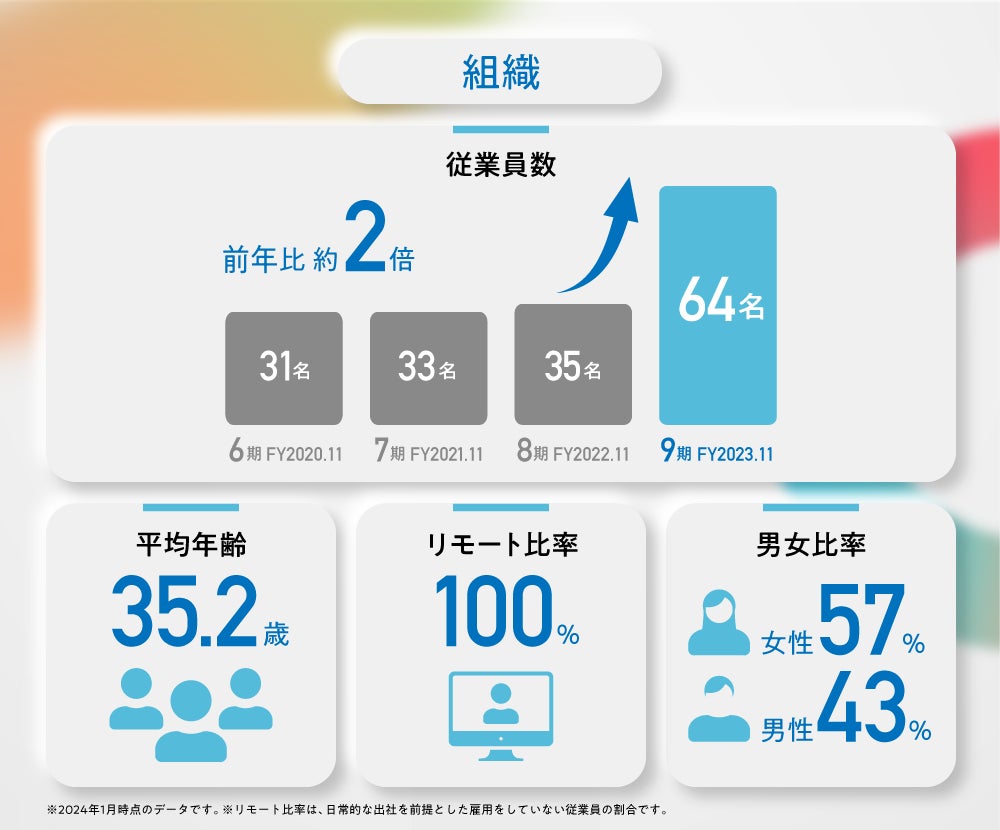 当社では、これまでに大企業からスタートアップ企業まで累計1,200社以上のお客様に対し、採用マーケティングの戦略・実行をワンストップで支援してきました。労働人口減少や職種の多様化、キャリア志向の高まりを受け、新しい採用手法を求める顧客ニーズが増加し、売上高は前年比約2倍へ成長、組織規模は35名から64名へと拡大しています。