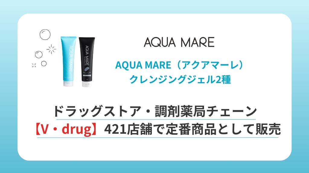 マーケティング支援を手掛ける株式会社Minato(本社:東京都港区、代表取締役CEO:山﨑雄太/以下「当社」)の子会社である株式会社4-smile(本社:東京都港区、代表取締役:長谷川 慎 以下「4-smile」)が展開するスキンケアブランド〈AQUA MARE(アクアマーレ)〉は、中部薬品株式会社が東海・北陸・近畿地域で展開するドラッグストア・調剤薬局チェーン【V・drug(ブイ・ドラッグ)「以下、V・drug」】421店舗※において定番商品として販売を開始しています。また2024年12月現在、V・drugの店舗でのプロモーションを継続展開しています。