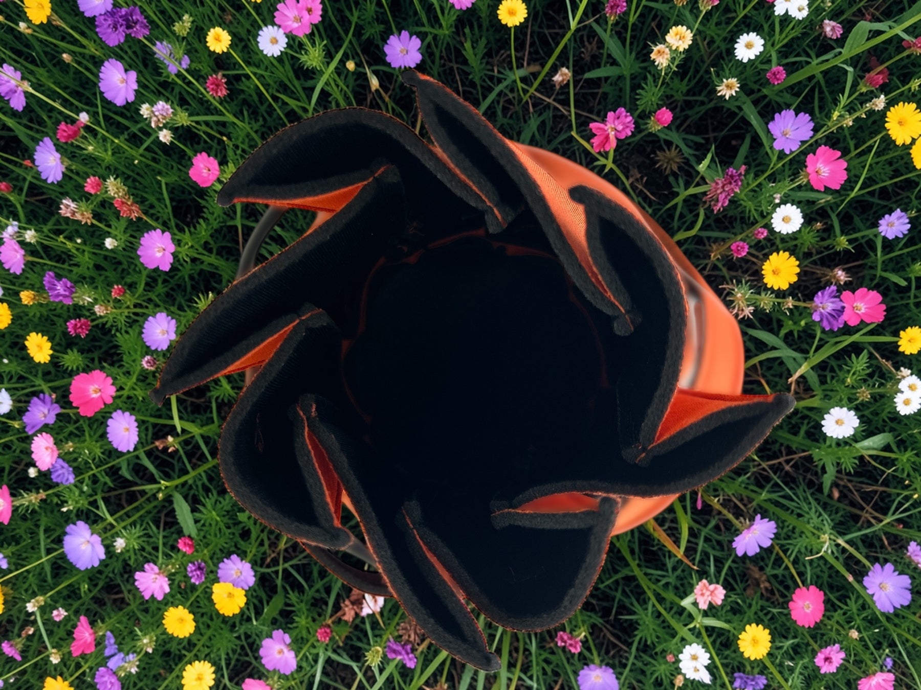 花が開くように口が広がり、中身が見やすく“ポイっと入れられる”。