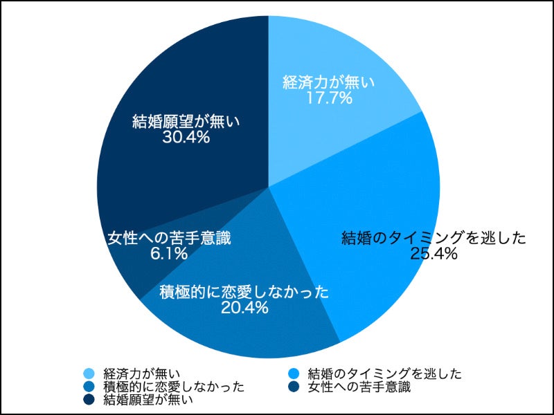「本人の結婚願望が無い」を選んだ人が30%で最多となり、次が「結婚のタイミングを逃した」で25%となっています。若いうちに積極的に恋愛しなかったを選らんだ人も20%いました。