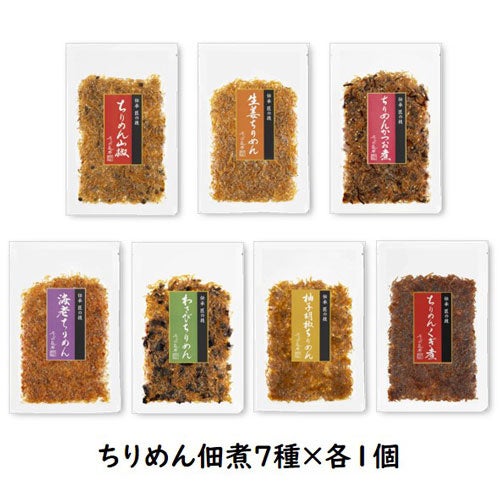 定番のちりめん山椒、ピリ辛の味付けのわさびちりめん、甘口でお子様に人気の海老ちりめんなど、全7種の味を食べ比べできる贅沢なセットです。