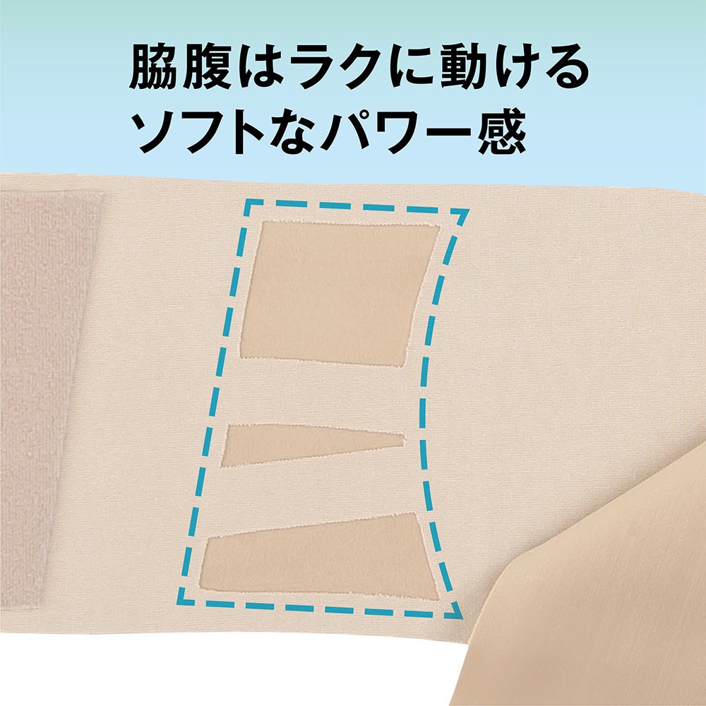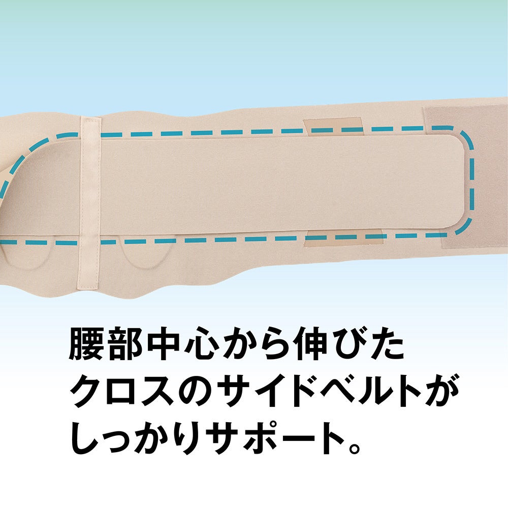 特殊ボーンが腰をしっかり安定させ、脇腹はラクに動けるがソフトなパワー感のあるライン。バイアステープの無いウェーブカットで肌当たりが良くアウターに響きにくい作りになっています。腰部中心から伸びたクロスのサイドベルトがしっかりとサポートしてくれます。