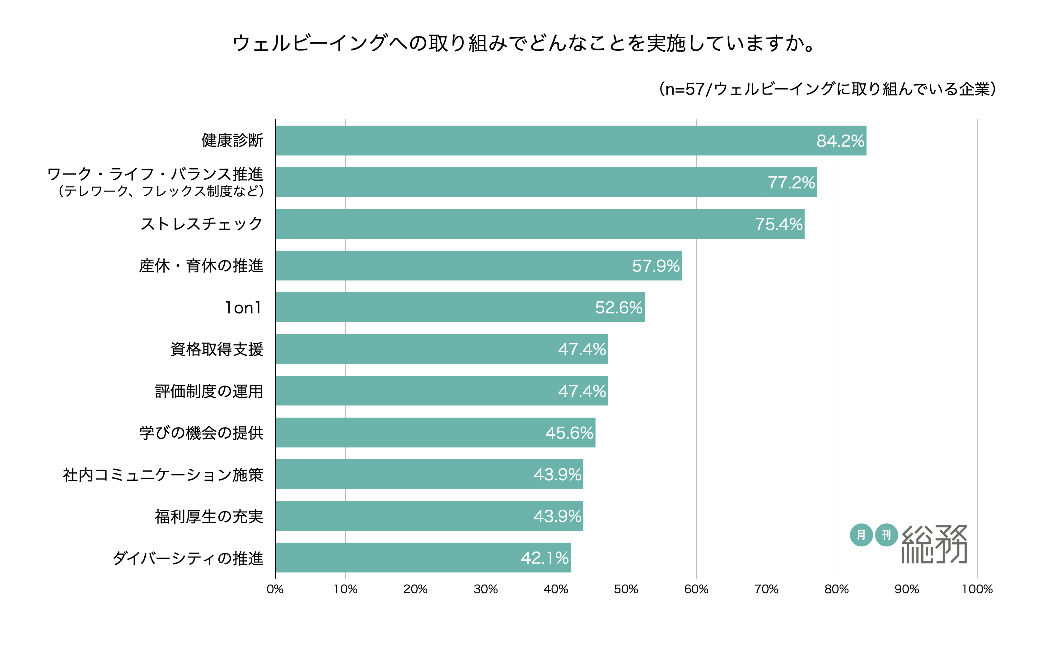 - ウェルビーイングの取り組みとして、約8割が「ワーク・ライフ・バランス推進」を挙げる