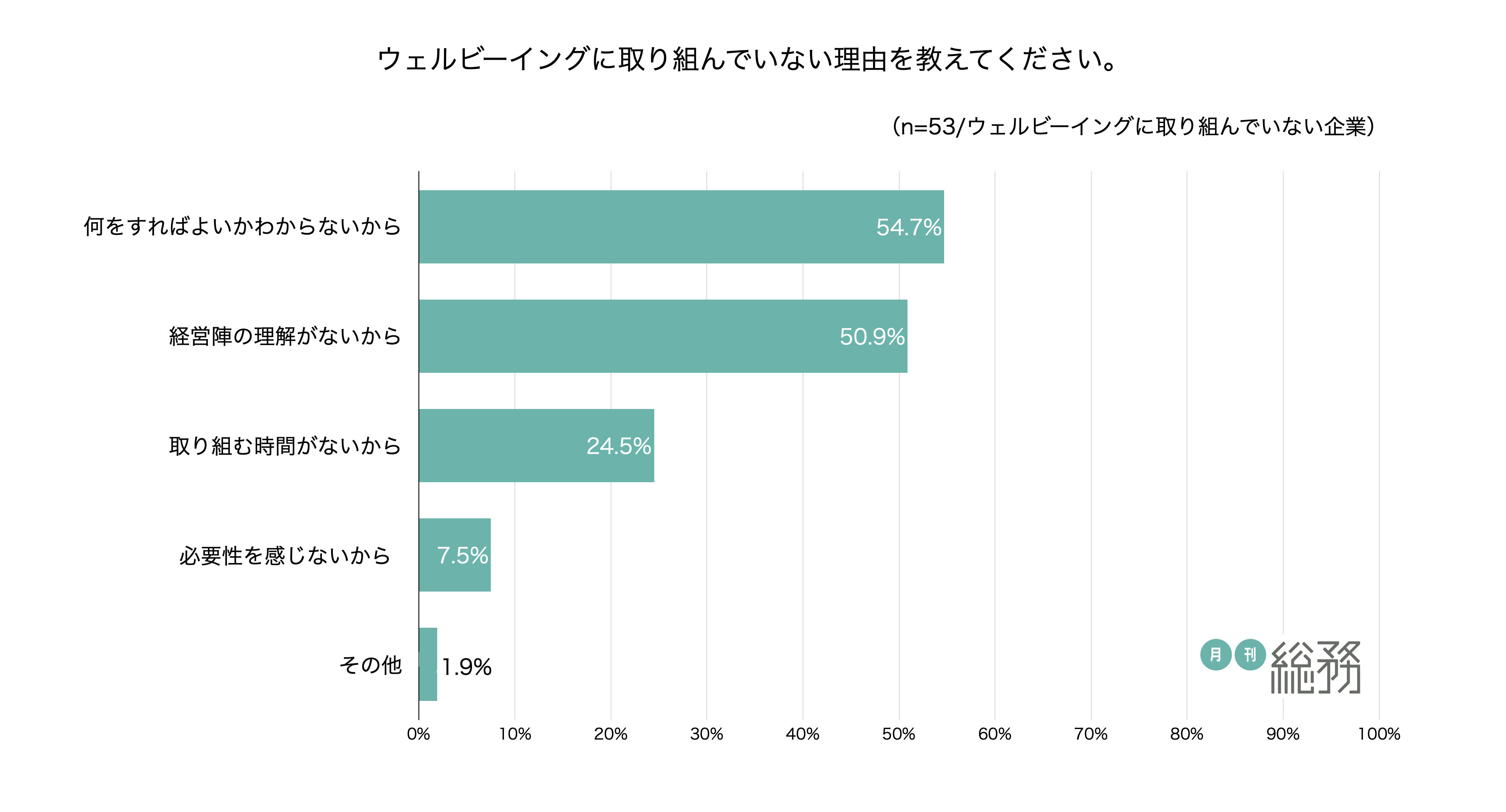 - ウェルビーイングに取り組んでいない理由は「何をすればよいかわからない」「経営陣の理解がない」など