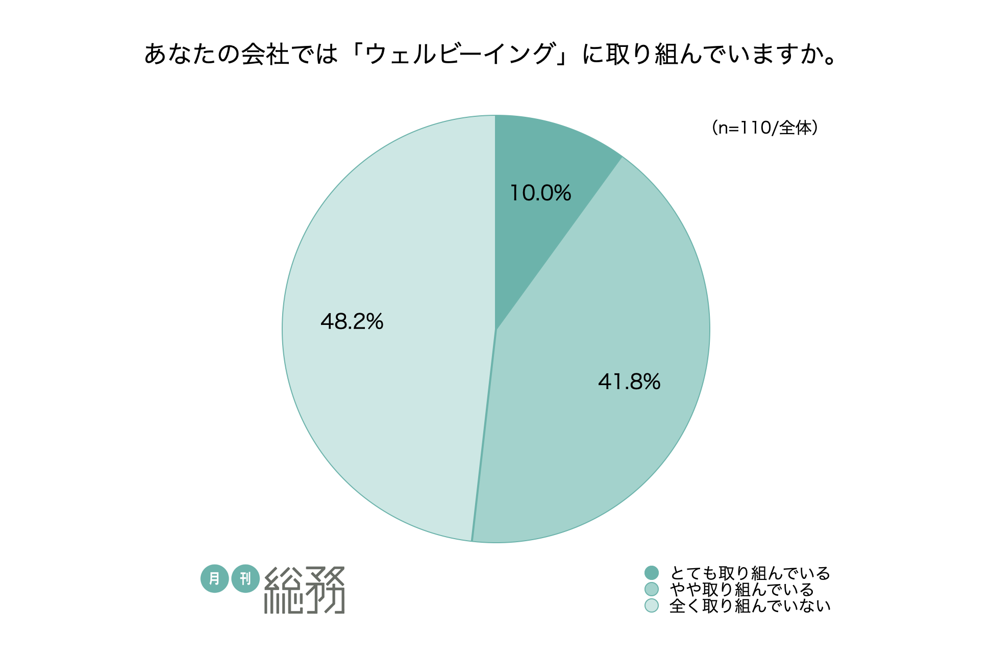 会社でウェルビーイングに取り組んでいるか尋ねたところ、「とても取り組んでいる」が10.0%、「やや取り組んでいる」が41.8%、「全く取り組んでいない」が48.2%という結果になりました(n=110)。