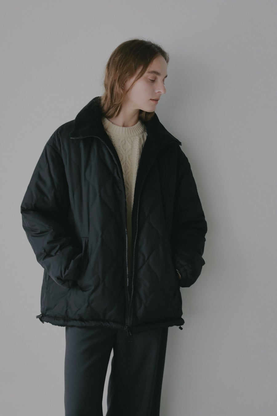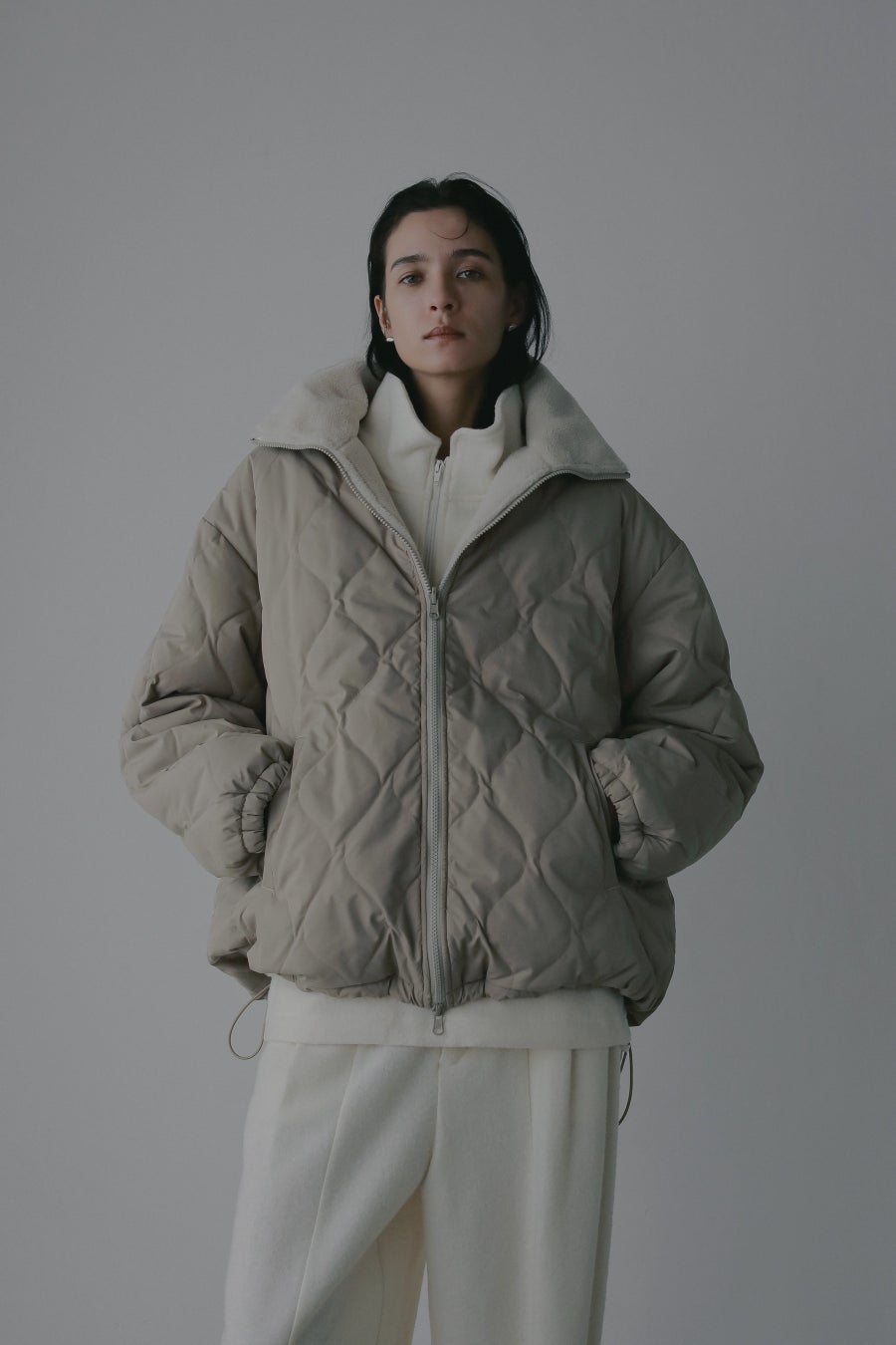 軽くて柔らかく暖かい、キルトデザインともこもこボア素材をリバーシブルでお楽しみいただける冬の着映えコート。裾のドロストコードでAラインコートから丸みを帯びたコクーンにシルエットの変化もお楽しみいただけます。高めのスタンドカラーが首元を暖かく包み込みながら顔まわりをすっきり華奢に見せてくれるのも嬉しいポイント。
