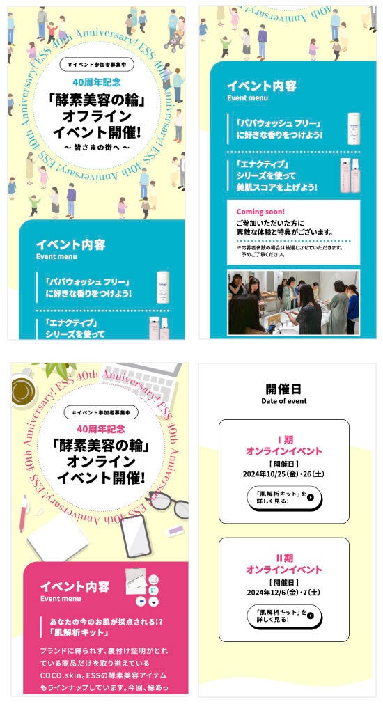 さらに、お客様に喜びや感動をお届けし続けてきたイー・エス・エスならではの、こだわりや魅力が詰まった40周年にふさわしい“特別な新商品”を順次発売し、ワクワク感とともに進化した酵素美容をお届けします。