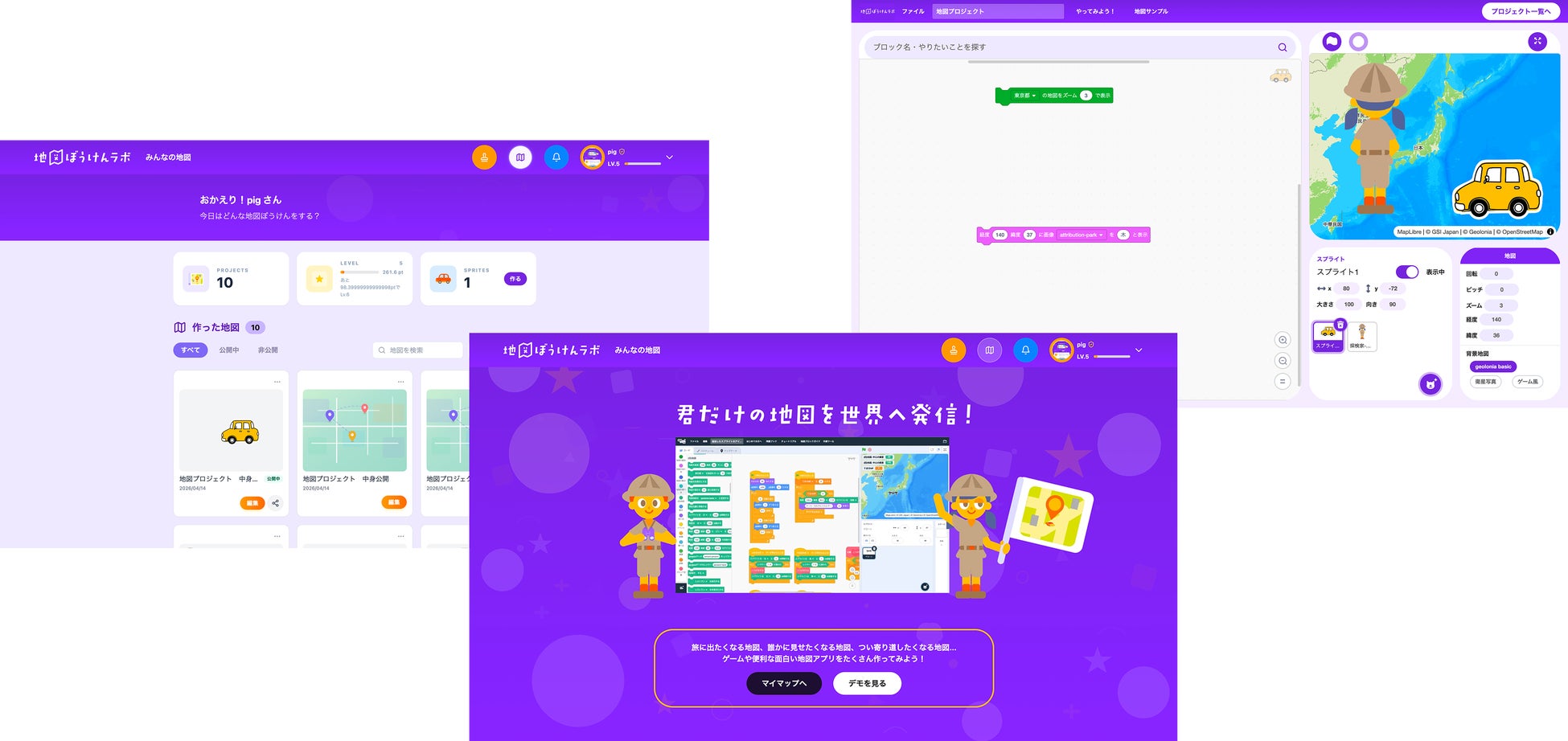 地図作品を簡単に作成・公開 :地図上にキャラクター(スプライト)やオブジェクトを配置し、Scratchベースのブロックプログラミングで地図作品を作成。作った作品は「みんなの地図」として公開・共有でき、他のユーザーの作品を見て学ぶこともできます。