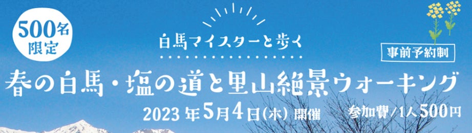 地元ガイド「白馬マイスター」が歴史ある古道「千国街道・塩の道」と春の白馬の絶景スポットをご案内するウォーキングツアー。約10㎞のコースの道中では、春の花々や残雪の残る北アルプスの絶景を眺めながら歴史を感じられる長谷寺、飯森神社、大出公園などを巡ります。参加者には記念品と宿泊割引券をプレゼント。さらに、昔の旅人の姿やボッカなど塩の道にまつわる衣装で参加してくれたお客様には、ちょこっとプレゼント(非売品)等もご用意しています!