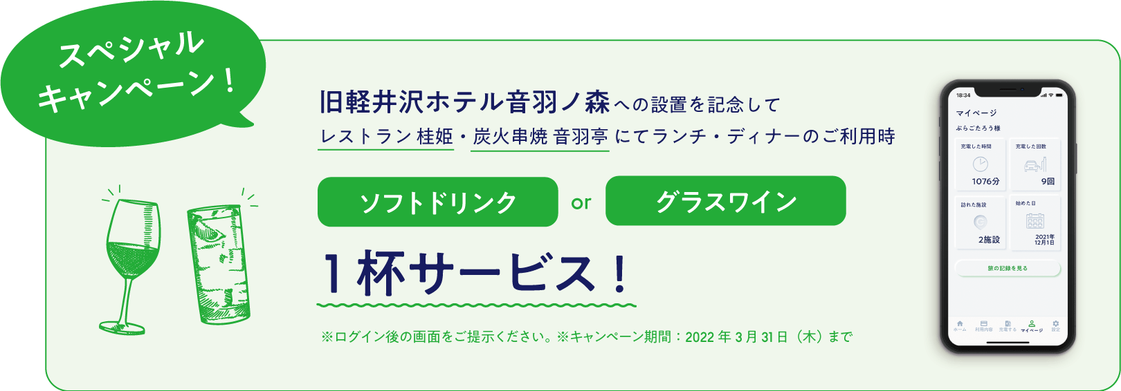 ホテル内のレストラン桂姫、炭火串焼 音羽亭のいずれかでランチ・ディナーを利用するEVユーザーが、事前にインストールした充電予約アプリ“MY PLUGO”ログイン後の画面を提示すると、ソフトドリンクもしくはグラスワインを1杯サービスするキャンペーンを実施します。