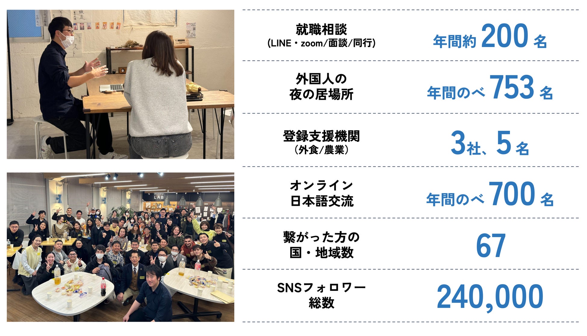 ・居場所の提供: 外国人留学生が気軽に立ち寄れる場所、いざという時の駆け込み寺としての活用 ・就職相談機能:就職相談や在留資格に関する専門相談に対応 ・交流拠点:在留外国人がGiverとなる夜の居場所事業(よるごはんmeeting)や企業連携イベント、外国人留学生が主体となったイベントなどの開催 |