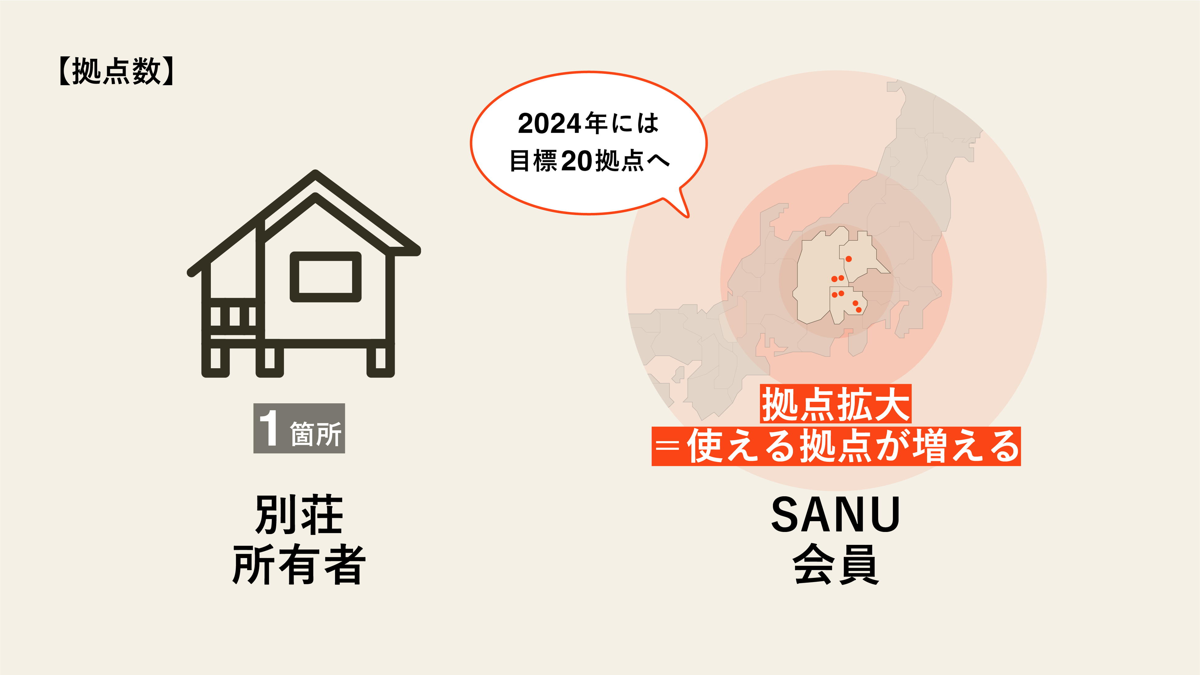 3)拠点数の比較: 別荘所有者1拠点、SANU会員現状7拠点