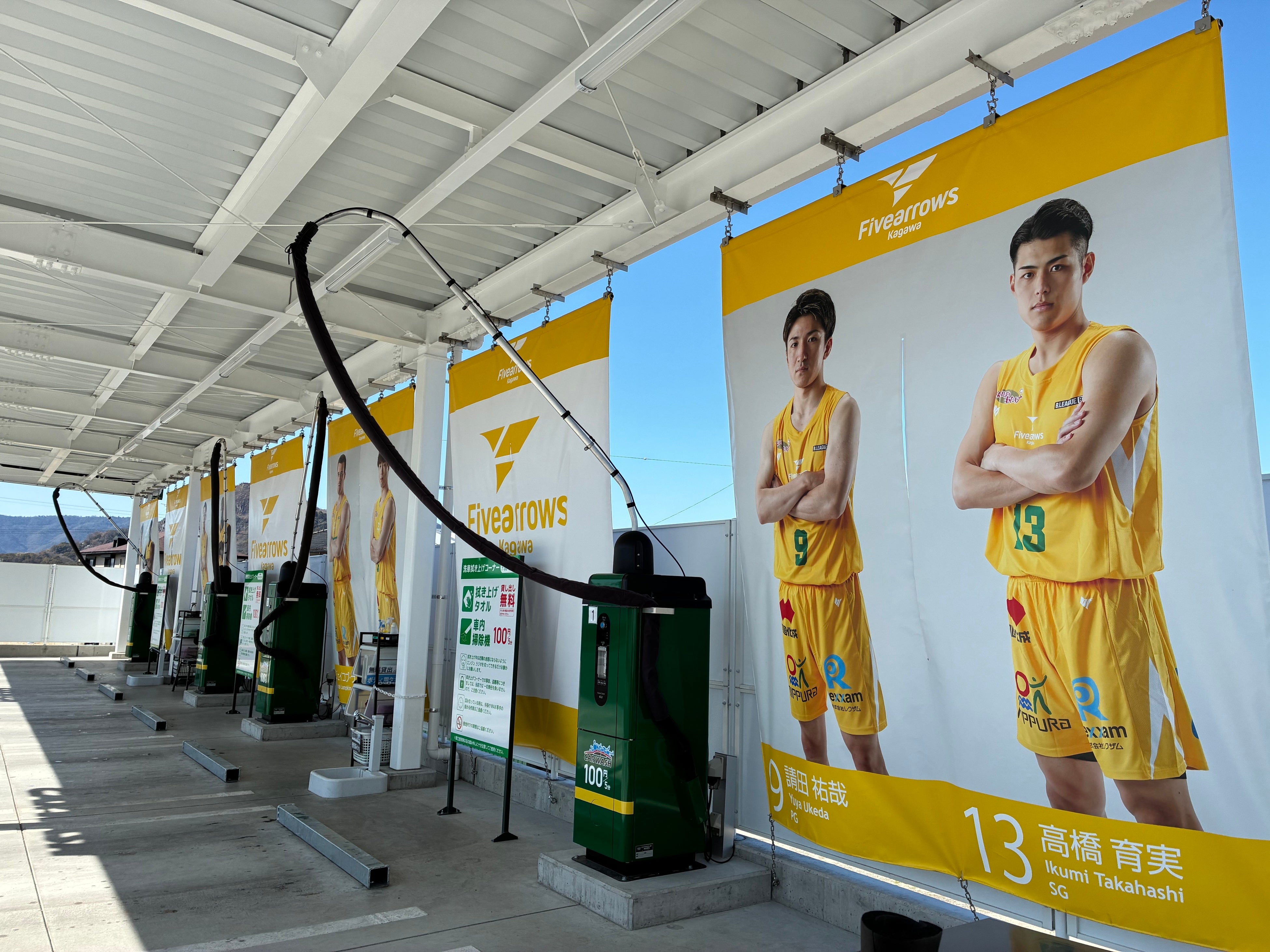 ヤマウチセルフ高瀬は、バスケットボールチーム「香川ファイブアローズ」を応援する特別装飾を実施し、店舗全体がファイブアローズカラーに装飾されています。