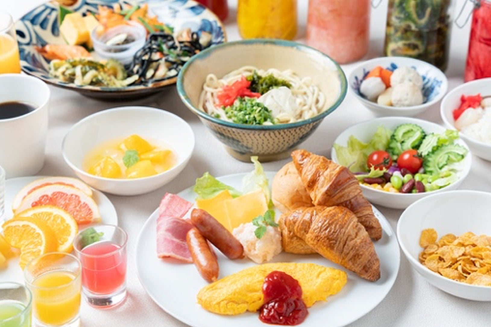 グランドキャッスルダイニングの朝食は、何といってもバラエティの多さが自慢。沖縄ならではのお料理もラインナップし、旅先の朝ごはんをご満喫いただけます。ヘルシーなサラダ、ビタミンと活力をチャージするフルーツなど、1日の元気を後押しするメニューが盛りだくさん。首里の丘に降り注ぐ朝の光とともにフレッシュな一日のスタートを応援します。