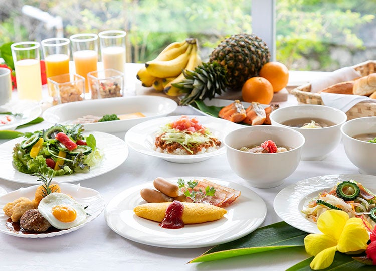 ザ・リバーサイド カフェ&ダイニングの朝食は、地元沖縄の食材をふんだんに使い、和・洋の定番朝食メニューはもちろんの事、沖縄ならではのお料理も楽しめます。さらにヘルシーなサラダ、ビタミンと活力をチャージするフルーツなど、1日の元気を後押しするメニューが盛りだくさん!30分おきに焼きあがる、焼き立てのクロワッサンもおすすめです。
