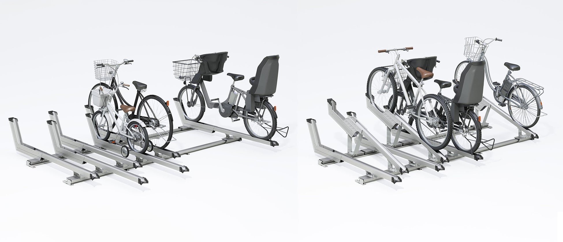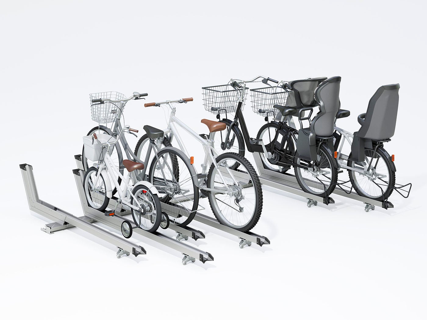 今回、発売する新商品は2本レール設計により設置面への安定度が高く、レールの上をラックがスムーズに動きます。SR-AFW型はラックを前後差で配列し、ハンドルやカゴの干渉を軽減するタイプ。SR-AHW型はラックを高低差で配列し、奥行きが取りにくい場所での省スペース設置を実現したタイプ。レールとラックの材質はアルミ製で、軽くて静かな操作性を実現。3人乗り電動アシスト自転車から幼児用自転車まで、様々な自転車を収容できます。収納可能自転車質量は40kg以下、対応タイヤ径は12~28インチ(※SR-AHW型のラック高仕様は16~28インチ)。