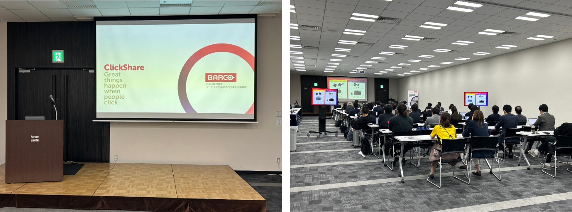 本新製品発表会では新しくなった ClickShare CX-50 の新たな機能が叶える今後のハイブリッドミーティングのかたちや、新製品の詳細について説明いたしました。さらに発表会の終了後には、製品の進化を実際に体験いただけるよう、協賛企業様製品とのコラボレーションで、ハイブリッドミーティングの環境を作り、出席者の皆さまにタッチアンドトライを行っていただきました。展示ブースではこの度発表したClickShare CX-50の特長である 2 枚のディスプレイへの同時出力や、ルームシステムが導入されているミーティングルームでのスムーズな資料共有、カメラ切り替えなどハイブリッドミーティングの最新ツールの体験ができ、会場は和気あいあいと盛り上がっていました。