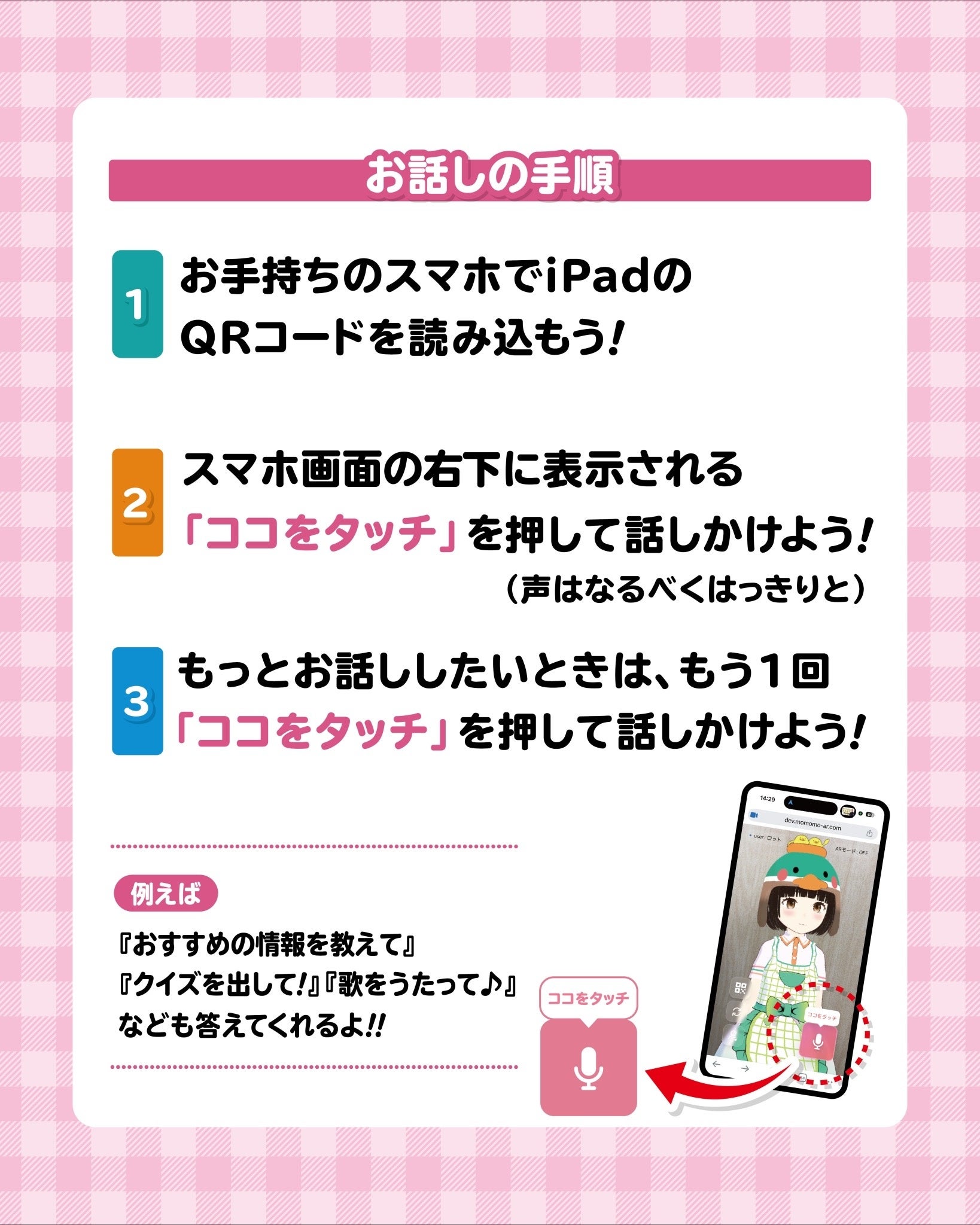 お手持ちのスマホで、iPadのQRコードを読み込み、スマホ画面の右下表示「ココをタッチ」を押して話しかけてみましょう!