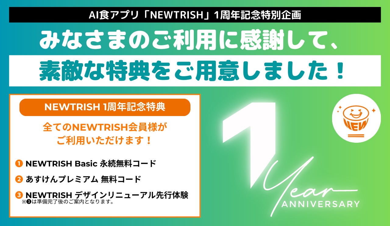 NEWTRISHは2023年1月にサービスを開始してから1周年を迎えました。そこで、ユーザーの皆様へ感謝の気持ちを込めて1周年記念企画を実施します。この企画はすでにアプリをダウンロードしている方はもちろん、新たにNEWTRISHをダウンロードしたユーザーの方も対象となります。