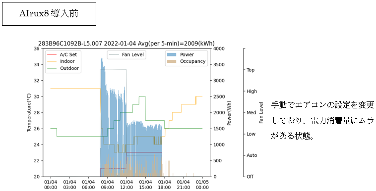 AIrux8を導入することで外気温に合わせて緩やかに温度調整を行うことができるため、消費電力を大幅に抑えることが可能になり、また、人感センサーにより人の動きもチェックできるため、空間の混雑状況に合わせてエアコンや照明のオンオフ、エアコンの温度調節を自動的に行い、無駄なエネルギーをカットすることが可能となります。