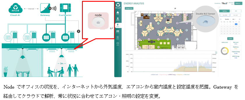 AIrux8は、天井に設置された人感センサーを組み込んだ「Node(ノード)」と呼ばれるセンサーを通して、施設内の混雑状況や不在状況等のデータを取得し、AIで解析、空調・照明(調光照明)を自動調整し、無駄な電力をカットして省エネにつなげるサービスです。その仕組みは、まずエアコンで室内温度と設定温度をチェックし、次にインターネットから外気温を取得します。そしてNodeセンサーでオフィス内の状況を把握し、その情報をクラウドで解析し、自動でエアコンのON/OFF・温度・風量調節を行います。さらに、お客様の状況に応じて、施設内に設置された調光照明設備とも通信し、各照明のエリアグループ毎に時間帯、営業稼働日、季節により照明の明るさも自動制御します。