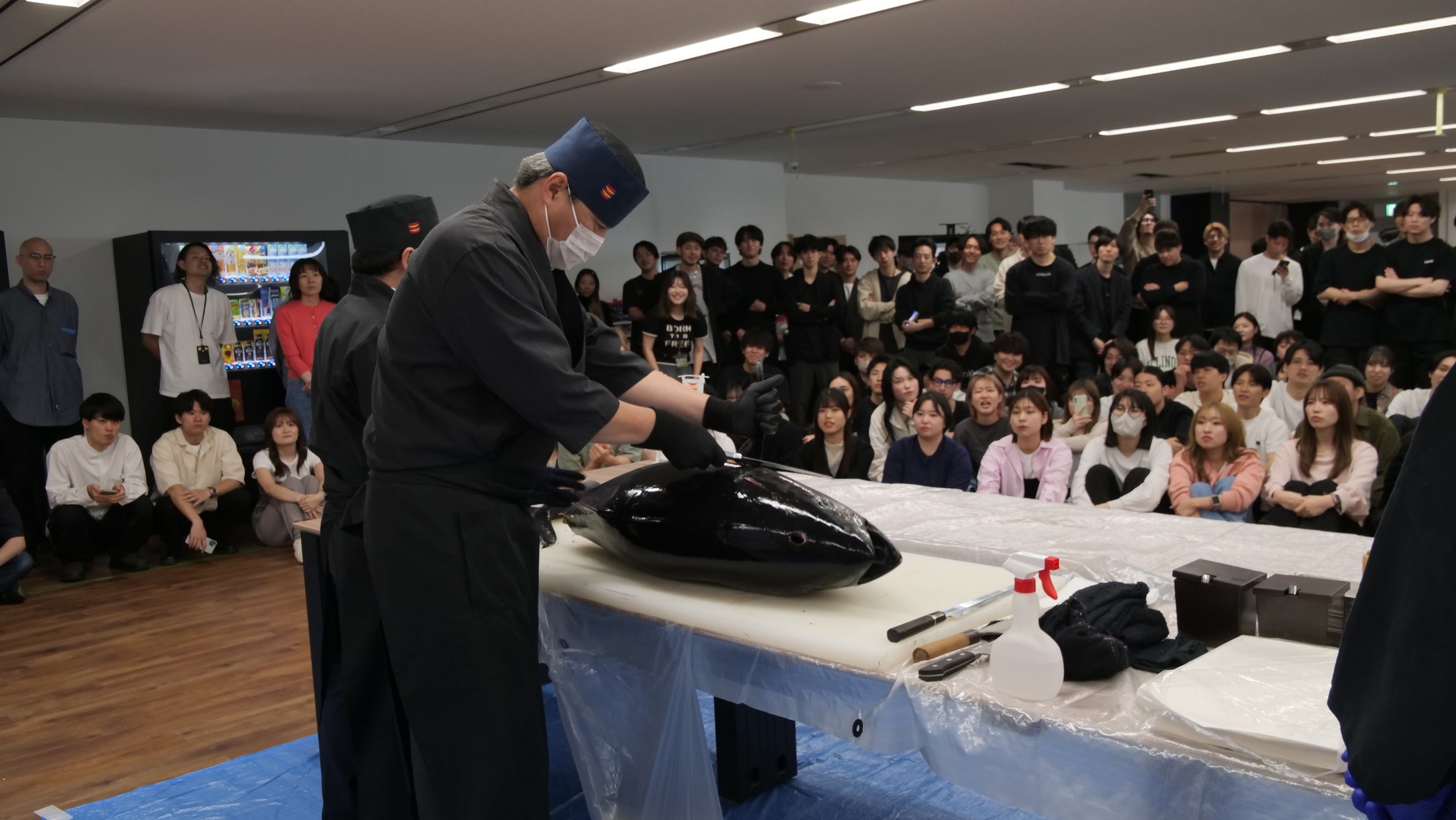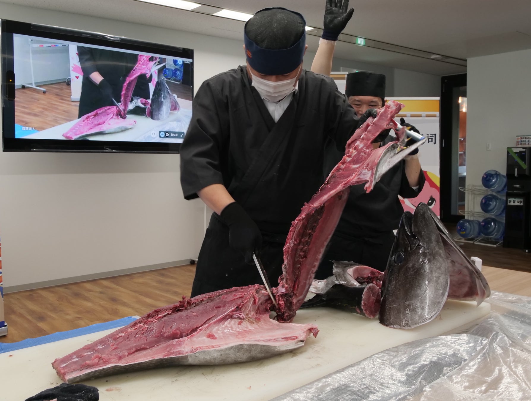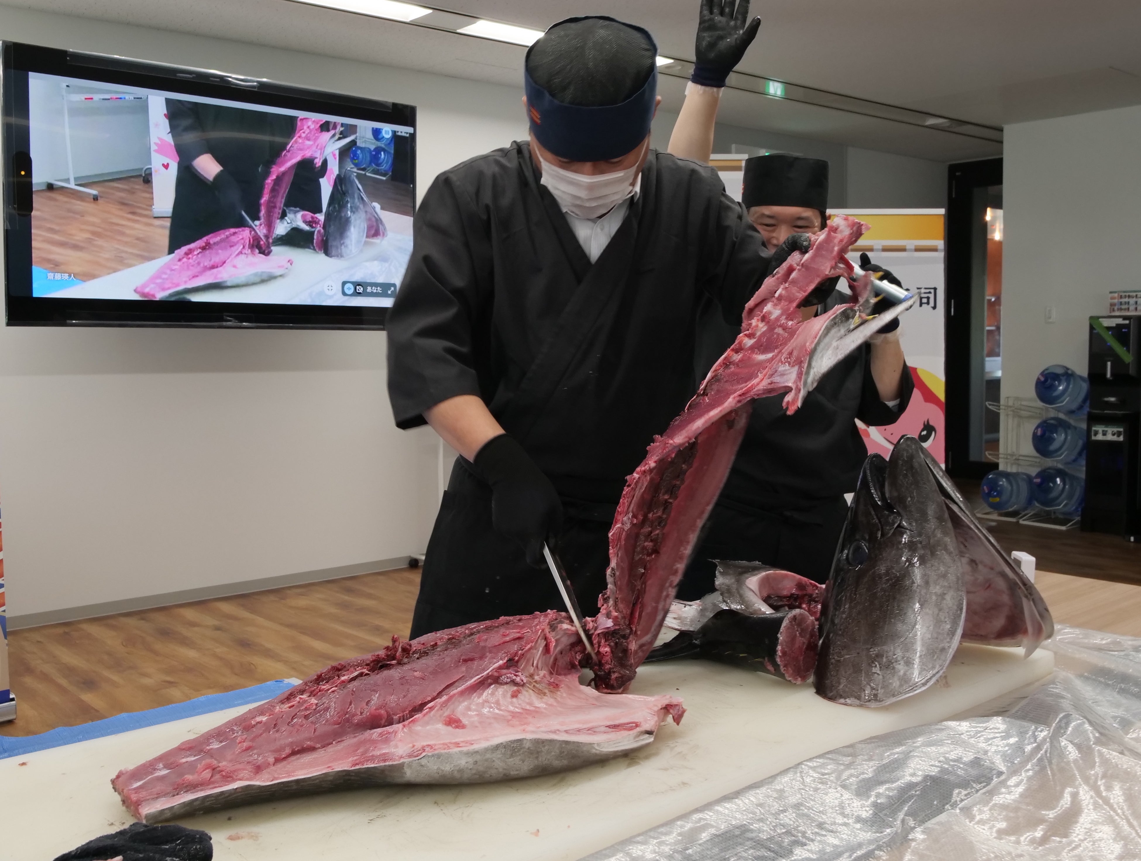 イベントは新オフィスの広々とした講義スペースで開催され、特別に招かれた熟練のマグロ解体職人が、約38Kgの新鮮な国産マグロを見事な手さばきで解体しました。