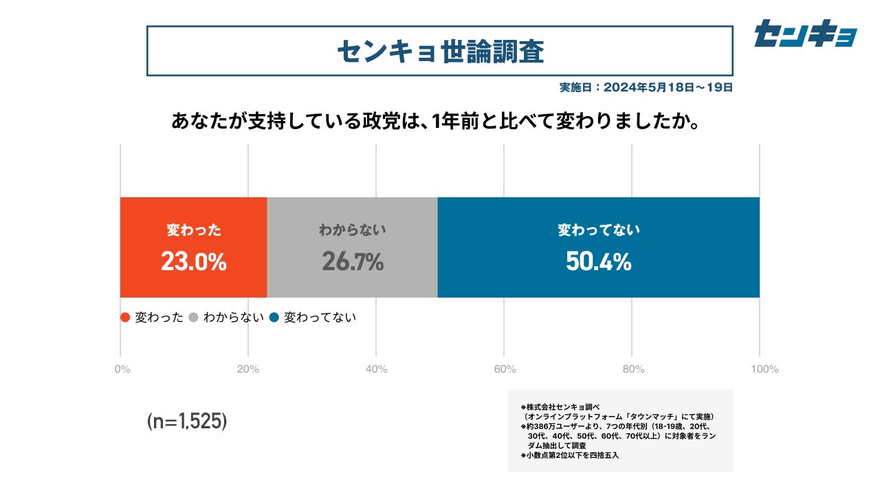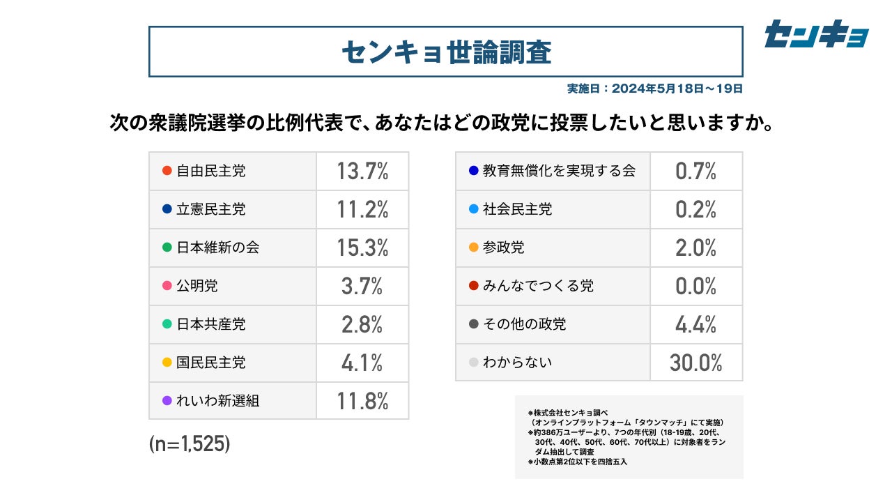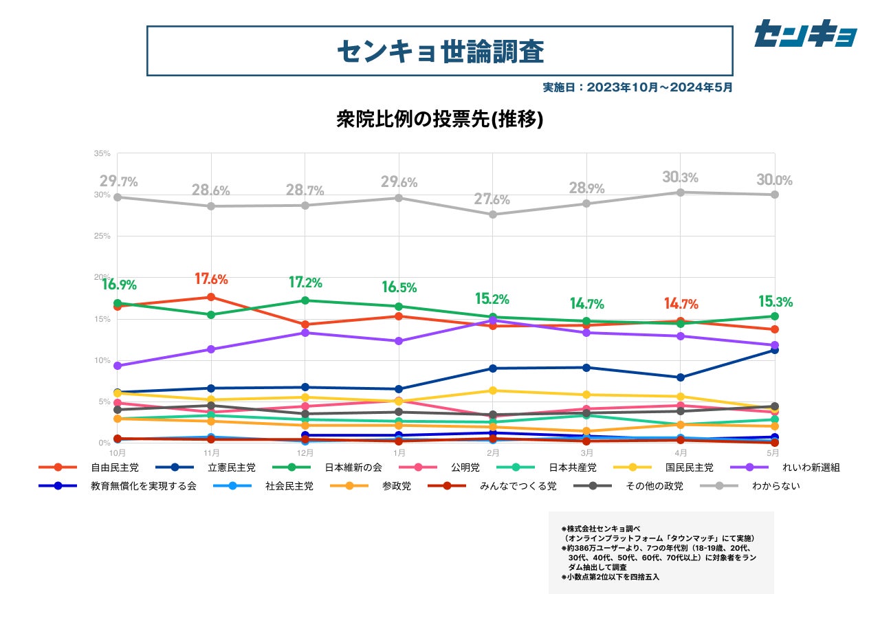 株式会社センキョ(所在地:東京都港区、代表取締役:堀 浩之)は、2023年8月より毎月、自社で運営する全国386万人余りの市民が参加するプラットフォーム「タウンマッチ」において、内閣の支持率や政党の支持率などを調査する「世論調査」を実施しています。政治に関する新たな調査データとして、政治関係者や有識者だけではなく、幅広く多くの方にご活用いただけますと幸いです。
