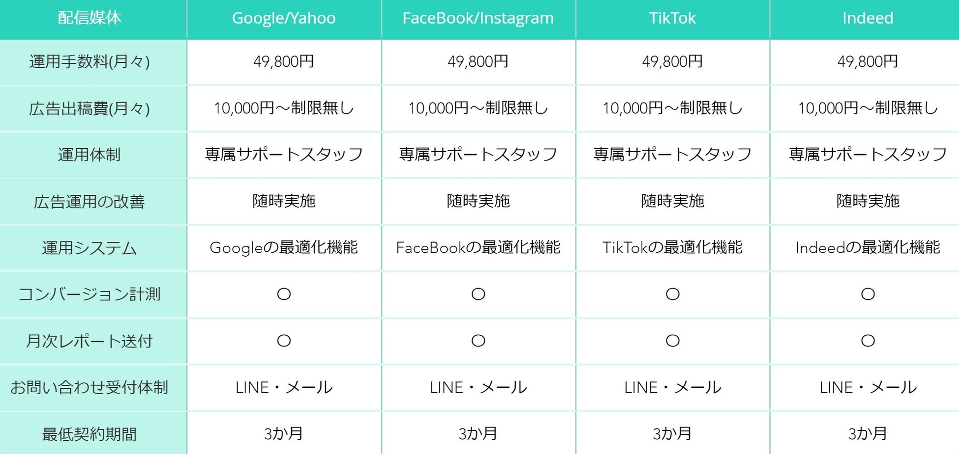 【内容】サブスク型の広告運用サポート(Google・Instagram/Facebook・Tiktok/Indeedから選択)