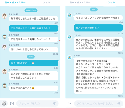 「フクマル」は、家族との対話をより自然で安心できるものにすることを目的として設計されたフクロウ型キャラクターです。「フクマル」とのトーク機能では、質問や相談に応じるだけでなく、家族のトークルームにも参加して投稿内容や会話の流れを学習し、適切なタイミングで話題を投げかけたり問いかけたりしてくれます。これにより、健康・介護・お金・相続といった“聞きにくい話題”も自然に共有しやすくなります。テキストや写真も送れ、日常の連絡ツールとしても活用できます。