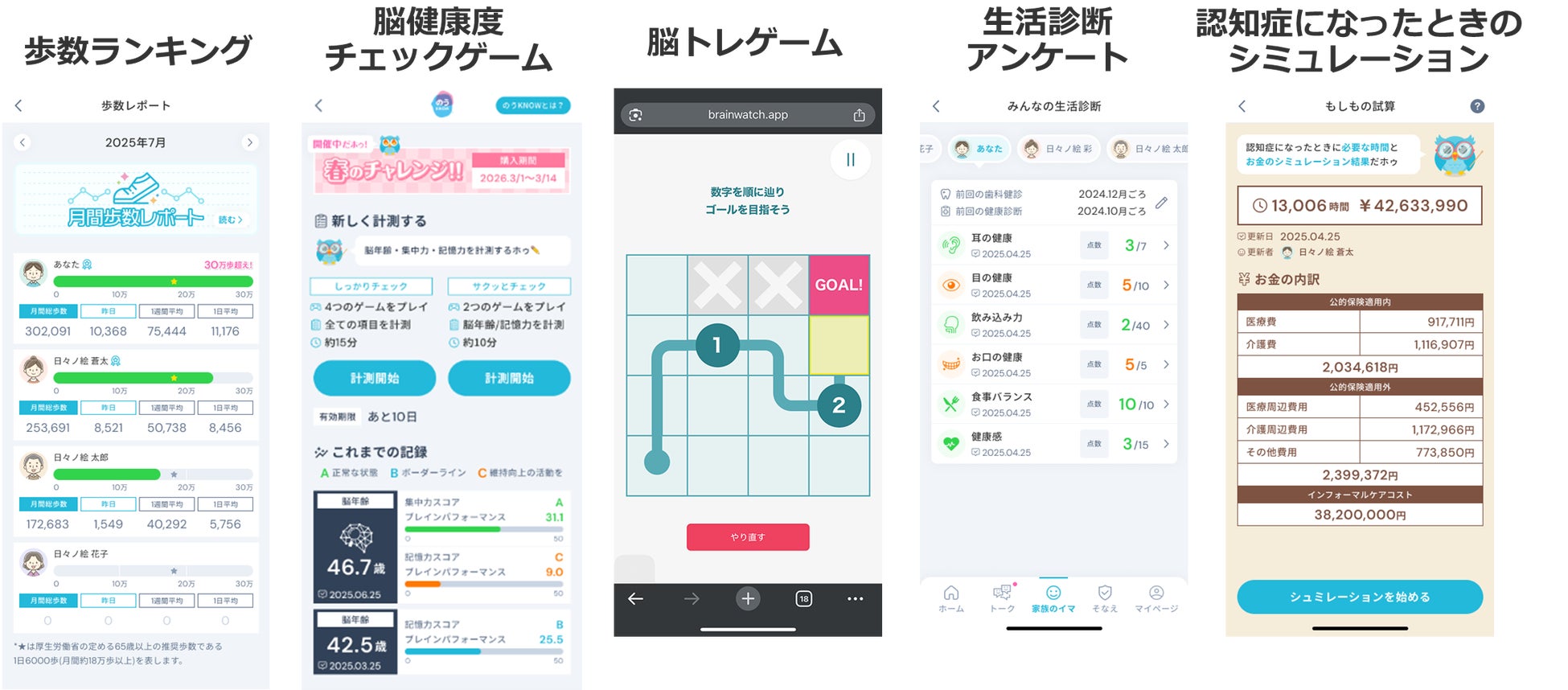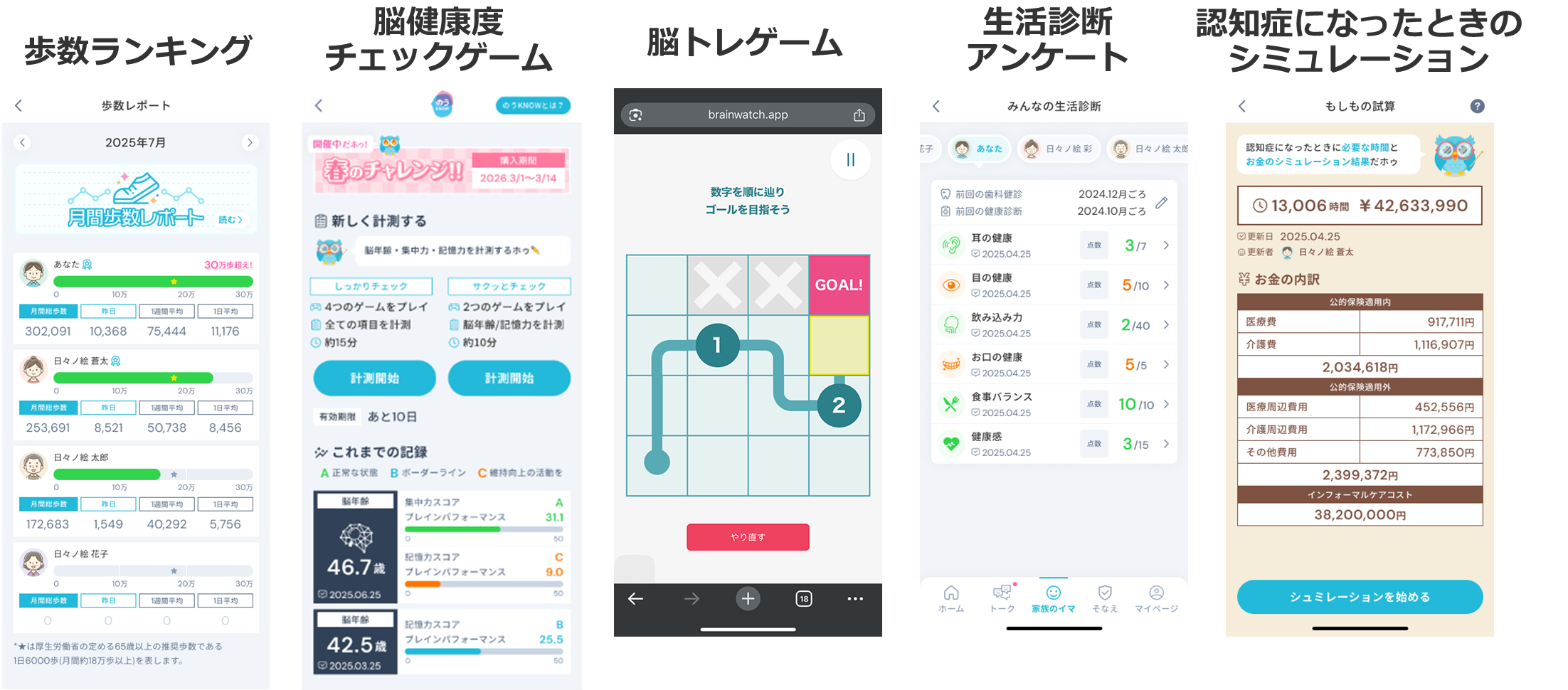 「家族のイマ」は、家族が楽しみながら健康状態や生活習慣について“気づく”ことを目的とした機能です。歩数や活動量がランキング形式で見えるだけでなく、脳健康度については当社が提供する認知機能チェックツール「のうKNOWⓇ」(非医療機器)を用いて脳年齢のスコアを算出し、家族で共有できます。加えて、脳トレゲーム、食習慣のセルフチェックや、もしものときに必要となる費用や時間のシミュレーション機能など、現在の状態だけでなく将来リスクの理解までを自然に促します。