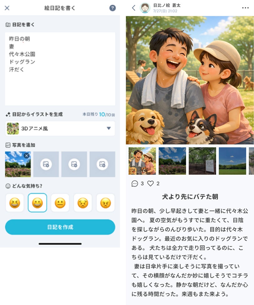 AI絵日記は、家族がお互いの“今”の様子を無理なく共有できるよう設計されています。短い文章や3〜5個のキーワードを入力するだけでAIが絵日記やイラストを自動生成し、ゆるキャラ風や水彩画風など好みのスタイルも選べます。言葉では伝えにくい近況や気持ちも自然に届けられ、投稿には「いいね」やコメントを返せるため、無理のない距離感でコミュニケーションが生まれます。