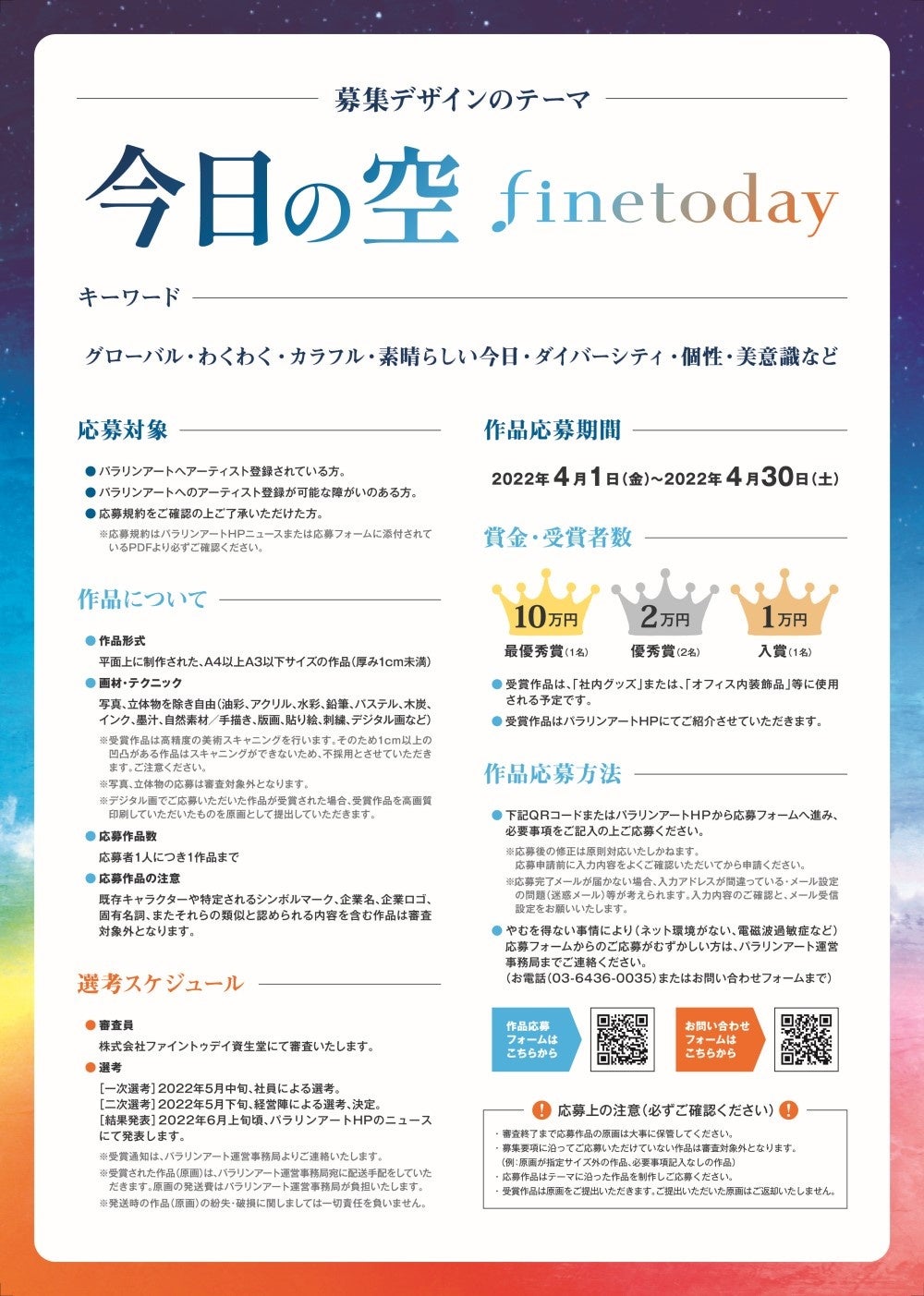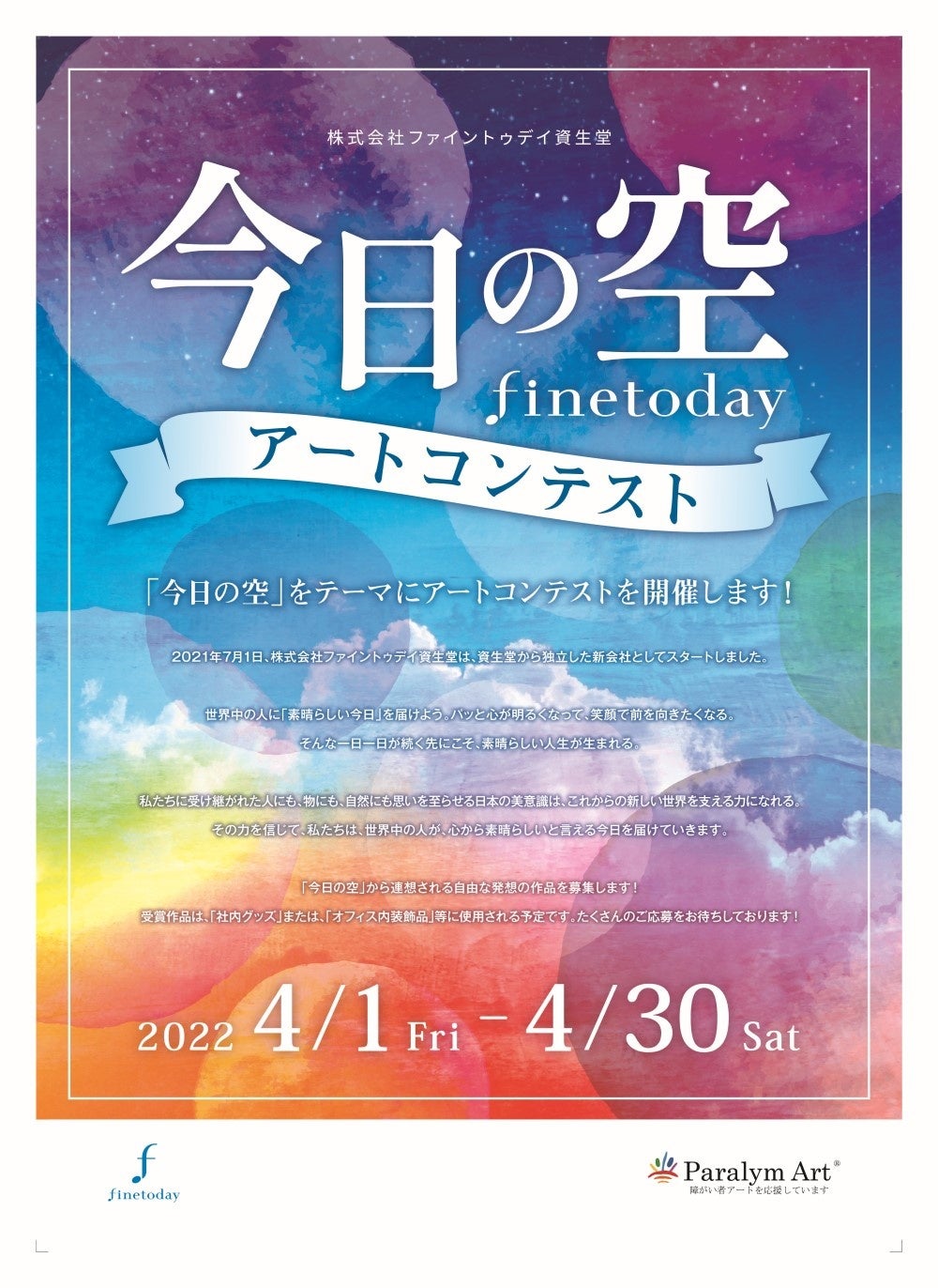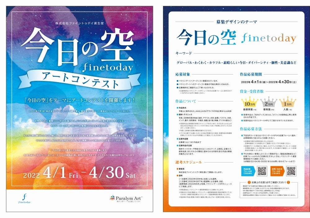 一般社団法人障がい者自立推進機構 パラリンアート運営事務局(代表理事:中井亮)はゴールドパートナー契約を締結した株式会社ファイントゥデイ資生堂(代表取締役 兼 CEO 小森哲郎)とともに、「今日の空 ~finetoday~」をテーマにしたアートコンテストを開催いたします。