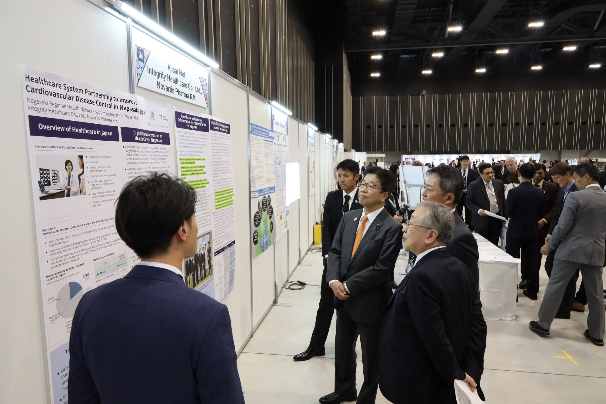 3者は、2022年4月に包括連携協定を締結し、保健医療DX(デジタルトランスフォーメーション)のロールモデルの創出ならびに患者貢献を目指し、急性心筋梗塞(Acute myocardial infarction: AMI)の二次予防への寄与を実現するべくデジタルクリニカルパス(AMIデジタルクリニカル)を、インテグリティ・ヘルスケアが開発・提供する疾患管理システムYaDocと接続されたあじさいネット上に構築し、病診連携の質、および利便性と効率性の向上に取り組んでいます。ポスターではこれら一連の取り組みを紹介しました。このポスター発表に加藤勝信厚生労働大臣をはじめ各国代表と積極的な意見交換がなされました。