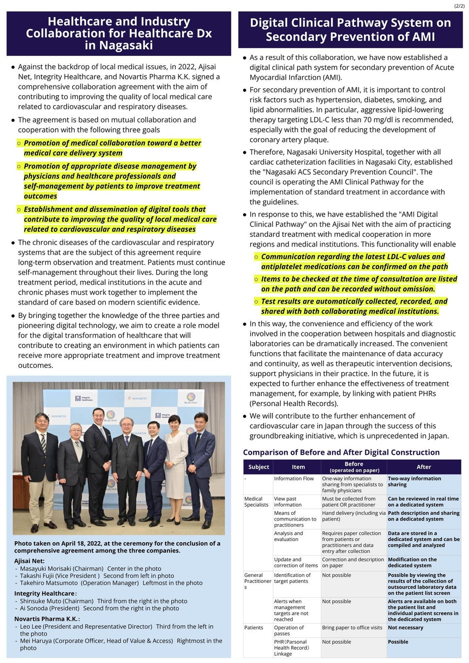 あじさいネット、インテグリティ・ヘルスケア、ノバルティス ファーマの3者包括連携協定、心筋梗塞の二次予防に向けて新たな一歩を達成 ~長崎ACS二次予防協議会作成の急性心筋梗塞二次予防クリニカルパス機能を構築~
