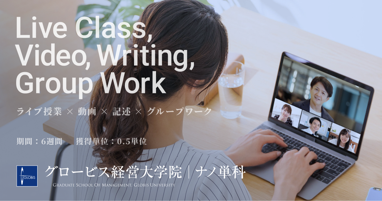 ナノ単科はグロービス経営大学院の卒業に必要な単位として認められる講座です。学生は、ナノ単科1科目修了につき、大学院の単位0.5単位を取得することが可能です。ナノ単科はGLOBIS 学び放題による動画学習・AIによる記述式学習・ライブ授業・グループワークなどで、MBAの基礎知識を習得できるプログラムです。全てオンラインで学び、グロービス経営大学院の単科やMBA進学へと継続学習が可能です。