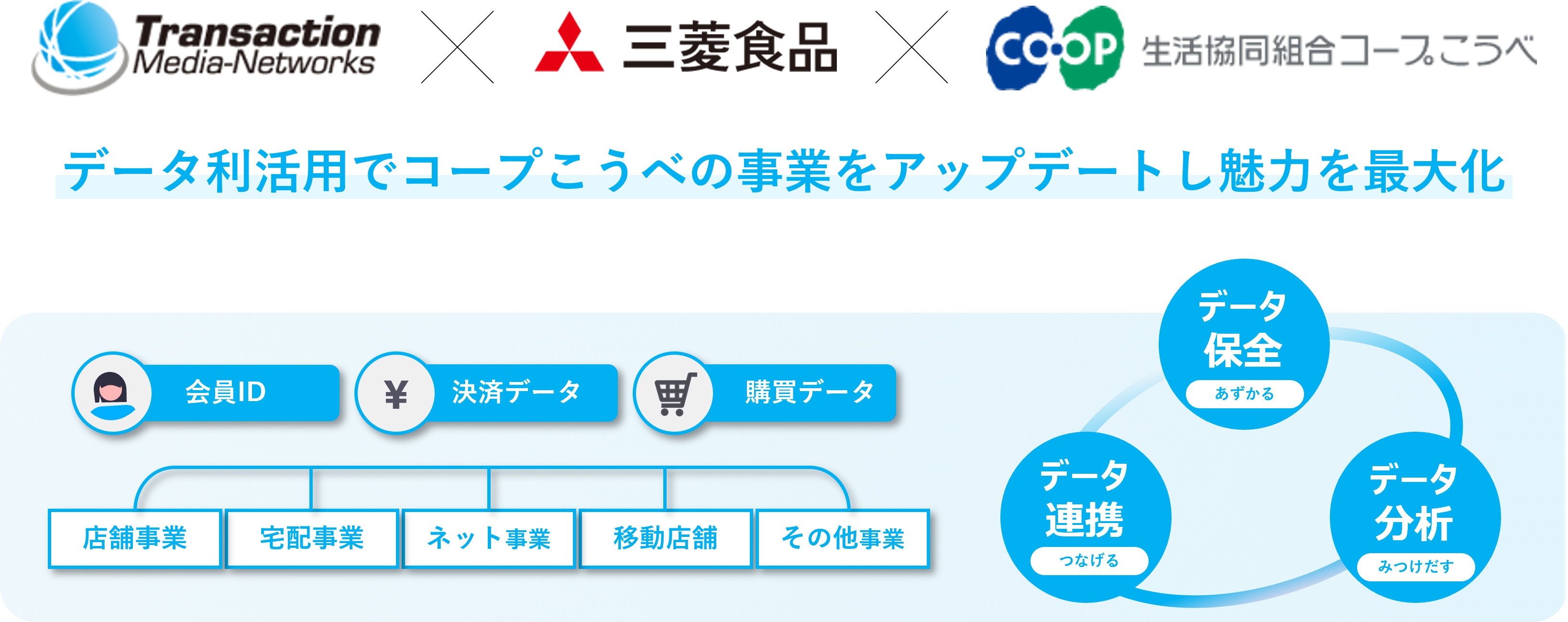 構築した共通会員基盤を活用すべく、小売業様へのサポートを通じて得られた深い生活者理解のノウハウを有する三菱食品と、年間20億件の決済処理実績のある決済サービスの他、クラウドPOSやハウスプリペイドなど小売店の高度化およびDXに向けたサービスを展開するTMNが連携することにより、コープこうべの魅力を最大化させることを目的とした本格的なデータ利活用に向けて、情報プロセシングの取組みを開始するに至りました。