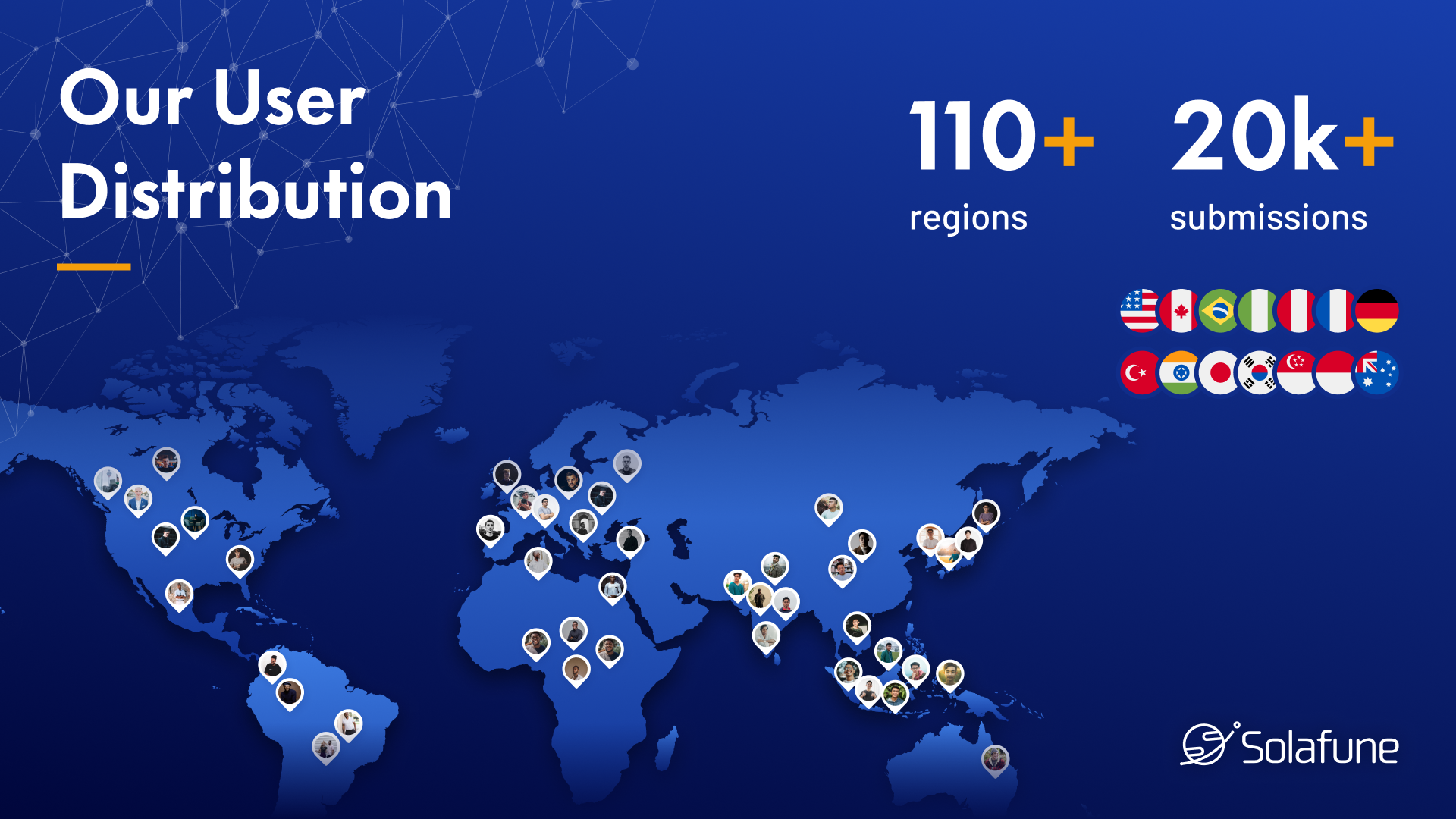 衛星データ解析プラットフォーム「Solafune」では世界中のエンジニアやデータサイエンティストがオンライン上で競技形式で衛星データ解析技術の開発に取り組んでおり、2024年8月29日時点で約110ヵ国・地域で利用されています。同プラットフォームではこれまで20,000件以上のアルゴリズムの開発が行われてきました。例えば世界中の鉱山の採掘が行われている場所の解析技術などが生まれています。 今後も「Hack The Planet.」をミッションに地球上のあらゆる事象をソフトウェアで記述することを目指し、世界中の大きな課題の解決に取り組んでいきます。