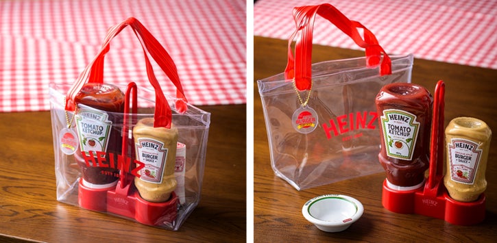 今回のイベントで当社が販売するのは、トマトケチャップ逆さボトルとバーガーソース、そしてこれらをテーブルに設置できる限定品のスタンド、トマトケチャップなどを入れるディッピングポットの4点を、「JAPAN BURGER CHAMPIONSHIP」キーチェーン付きのハインツロゴ入り透明バッグに入れた特別なセットです。グルメバーガー店やアメリカンダイナーなどでおなじみのケチャップスタンドは、置くだけで自宅でもバーガー店気分を楽しめます。また、アメリカンスタイルのバーガーソースはトマトベースの濃厚でクリーミーなソースに、ハーブの爽やかな味が効いた通常は業務用及び一部の別販路でのみ販売中の人気ソースです。