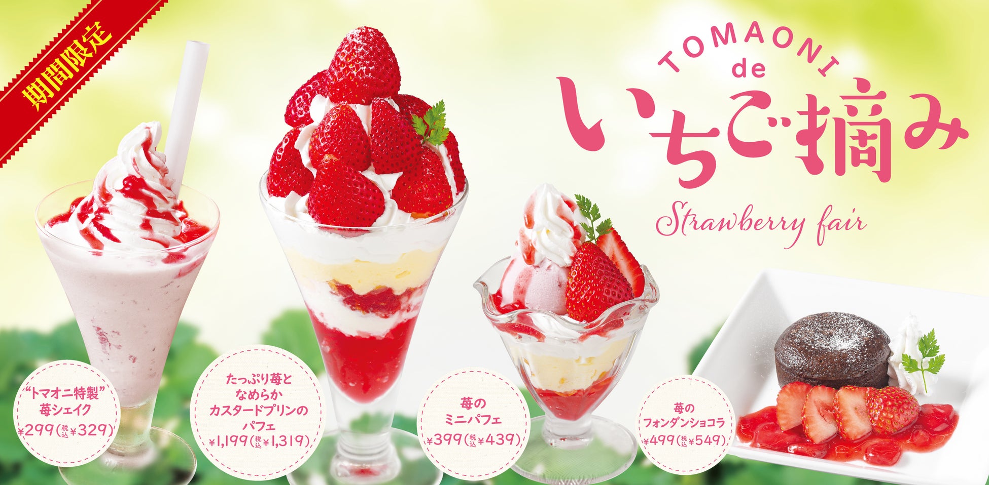 その他にも、お食事の後に最適な「苺ミニパフェ」や、アツアツとろーり食感がたまらない「苺のフォンダンショコラ」、いまでは定番となった「“トマオニ特製”苺シェイク」など“いちご”を贅沢に味わえるメニューを取り揃えております。是非この機会に、フレッシュないちごを心ゆくまで味わってください。
