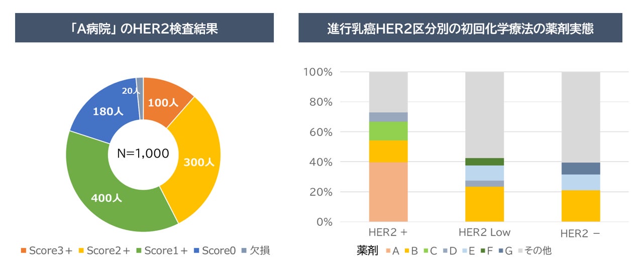 また、本プロジェクトに参画する製薬企業には、構造化したデータの集計情報(図2参照)をご提供することにより、臨床研究等での施設選定の効率化や、実臨床におけるバイオマーカー情報を活用したアンメットメディカルニーズの探索、治療実態把握等を可能とします。