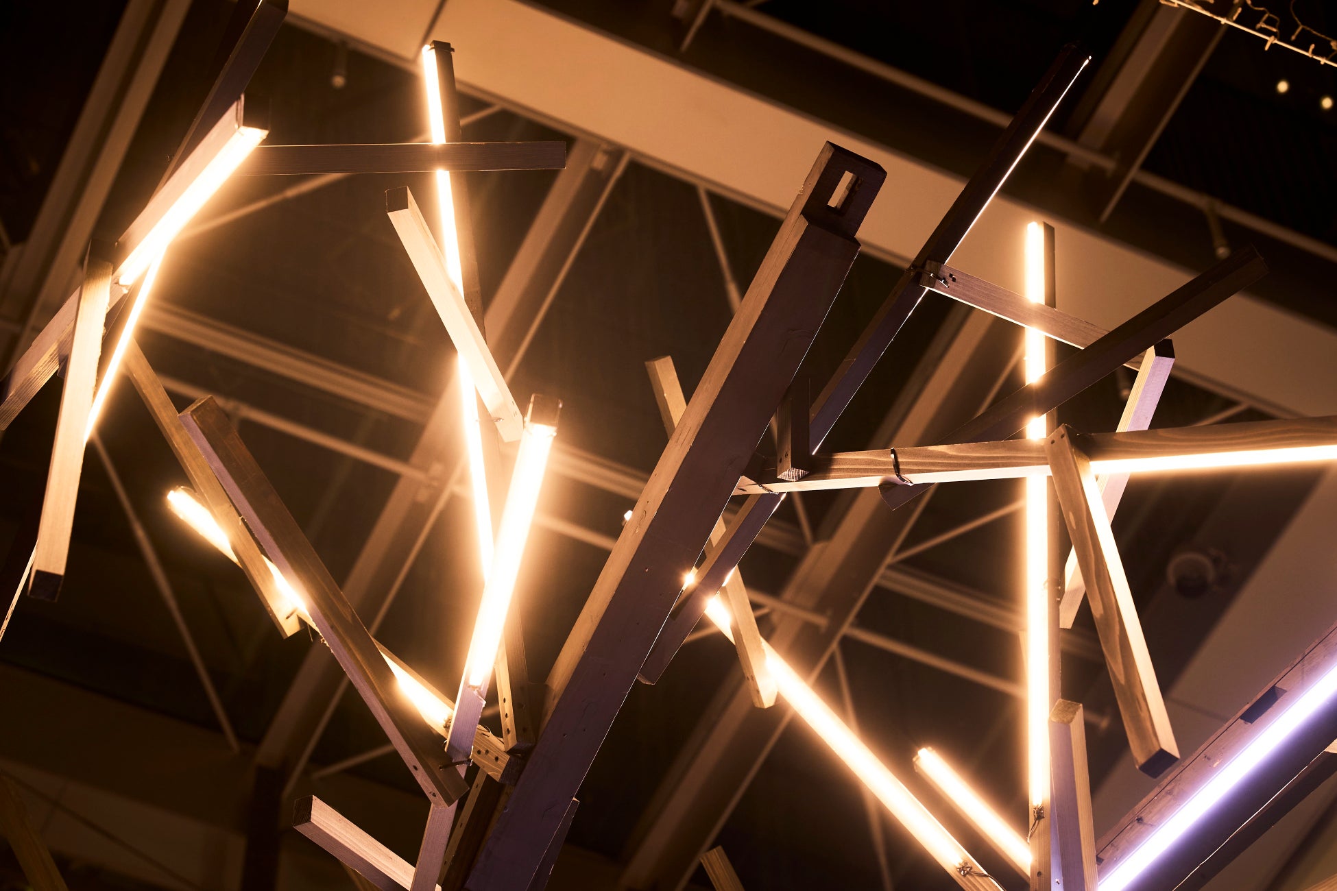 キンツギツギキは、石川県でも盛んな伝統工芸「金継ぎ」から着想を得たインタラクティブツリーです。石川と東京の木材を組み合わせて作られたツリーは、バラバラになったものを繋ぎ合わせる金継ぎのように、新たな輝きを生み出します。キンツギツギキは訪れる人のアクションによって特別な光と音の演出を披露。ツリーの台座に手をかざすと、それぞれのパーツを繋ぎ合わせるよう金色の光が駆け巡り、幻想的な音楽と合わせ空間を彩ります。プロデュースはHYTEK、空間・インタラクション設計は博展が担当。楽曲は石川県出身のアーティストKan Sano氏が提供。石川の資材は「のと復耕ラボ」&「古材クリエイト青組」や石川県の「フルタニランバー」、東京の資材は「森未来」と連携し、石川と東京の木材を組み合わせたツリーの造作を実現します。